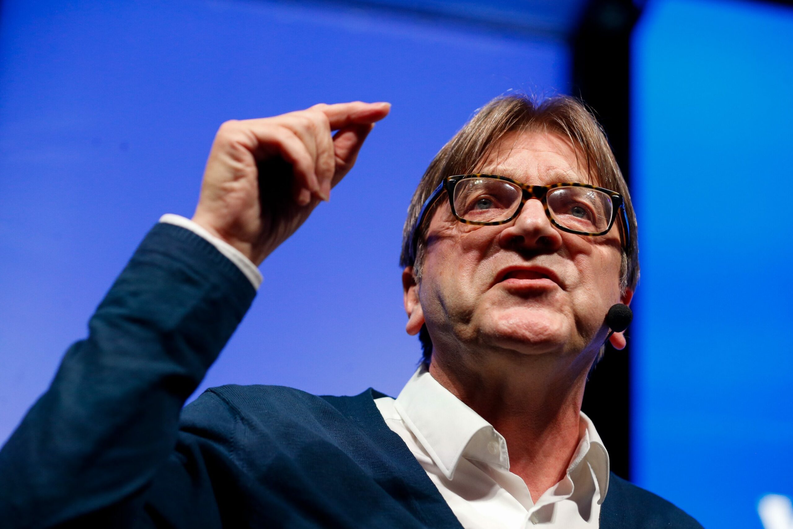 Former Belgian Prime Minister Guy Verhofstadt delivers a speech at a press meeting of French-speaking liberals MR and Flemish liberals Open VLD in Brussels. Credit: Belga