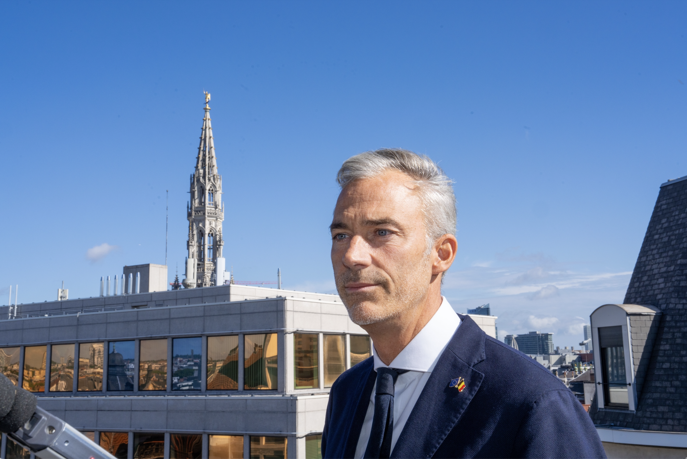 Les Engages's leader Yvan Verougstraete pictured at a press conference regarding the negotiations to form a new government for the Brussels Capital Region, on Monday 01 September 2025, in Brussels. Credit: Belga