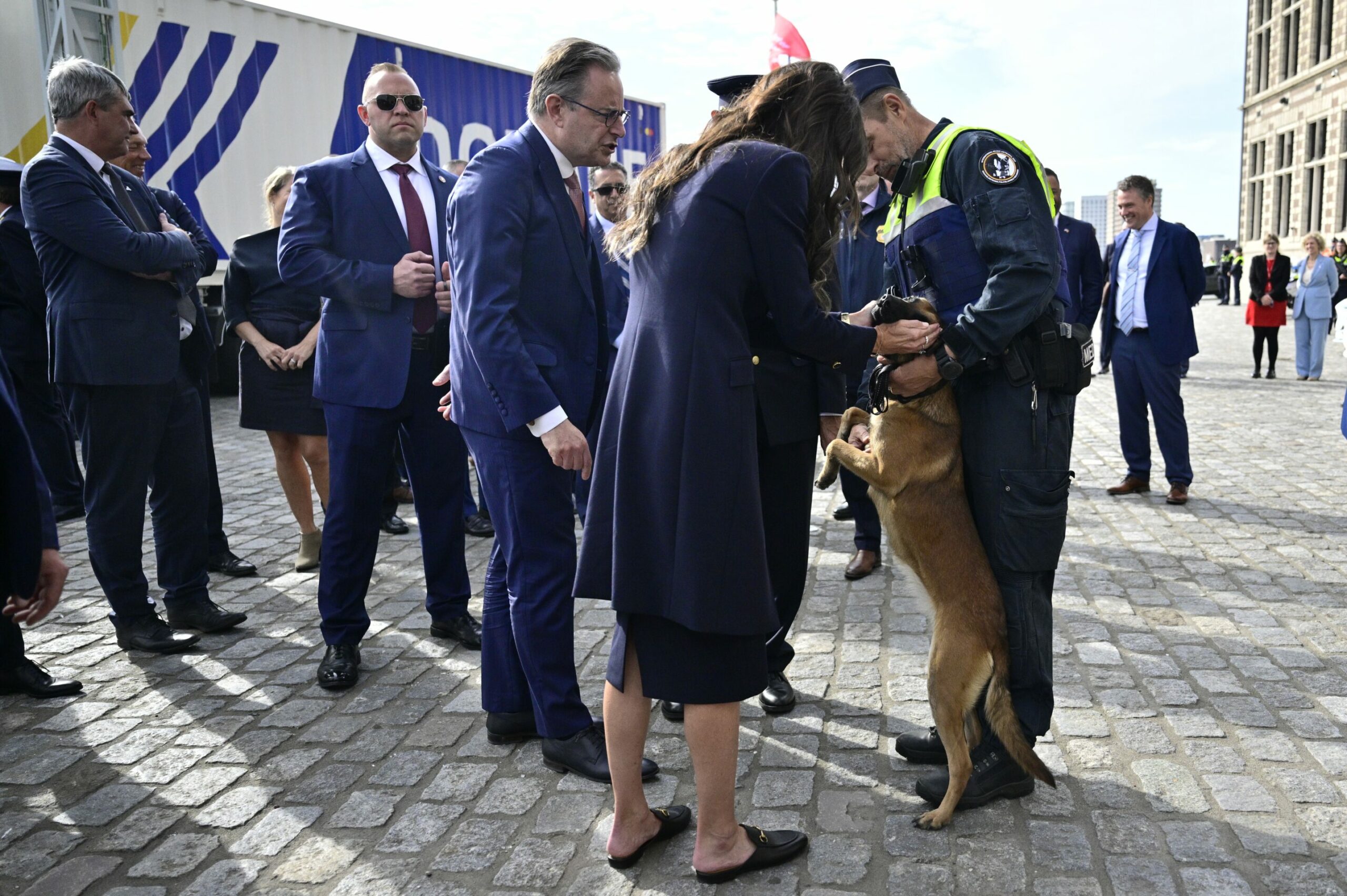 United States Homeland Security Secretary Kristi Noem stops to meet a police dog before a demonstration of customs' scanners. Credit: Belga/Dirk Waem