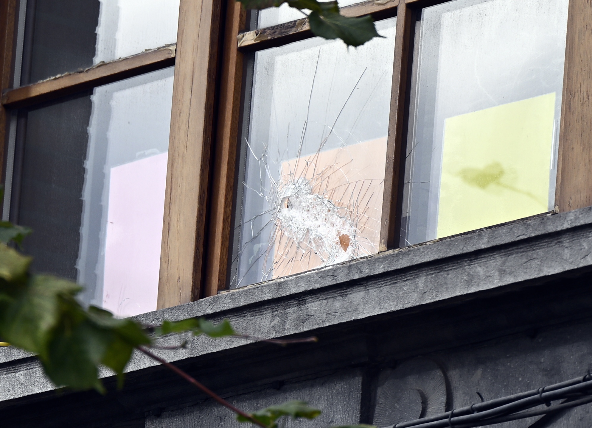 A close-up of bullet holes in the window of the Quatre Saisons school in Bethleem Place in Saint-Gilles. Credit: Belga.