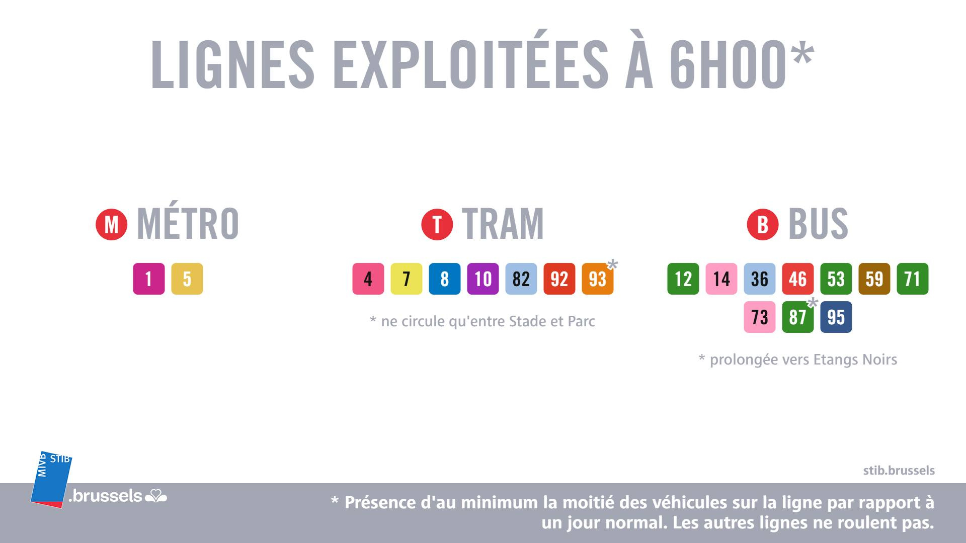 In terms of tram services, lines 4, 7, 8, 10, 82, 92, and 93 (between Stade and Parc) are running. Buses 12, 14, 36, 46, 53, 59, 71, 73, 87 (extended from Simonis to Étangs Noirs), and 95 are operating.