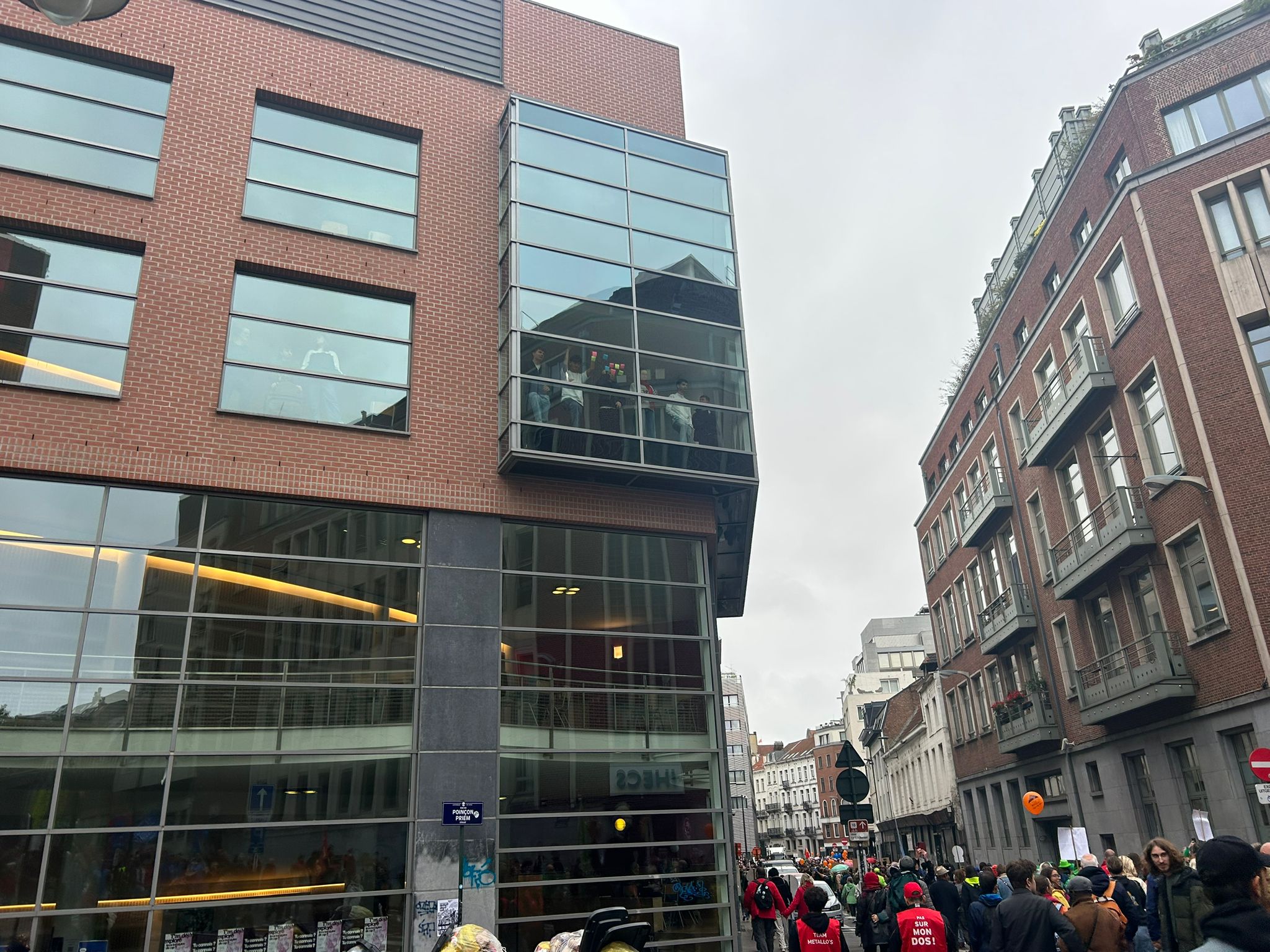 Students inside the IHECS university building were seen cheering on the demonstrators as they walk down Rue des Alexiens.