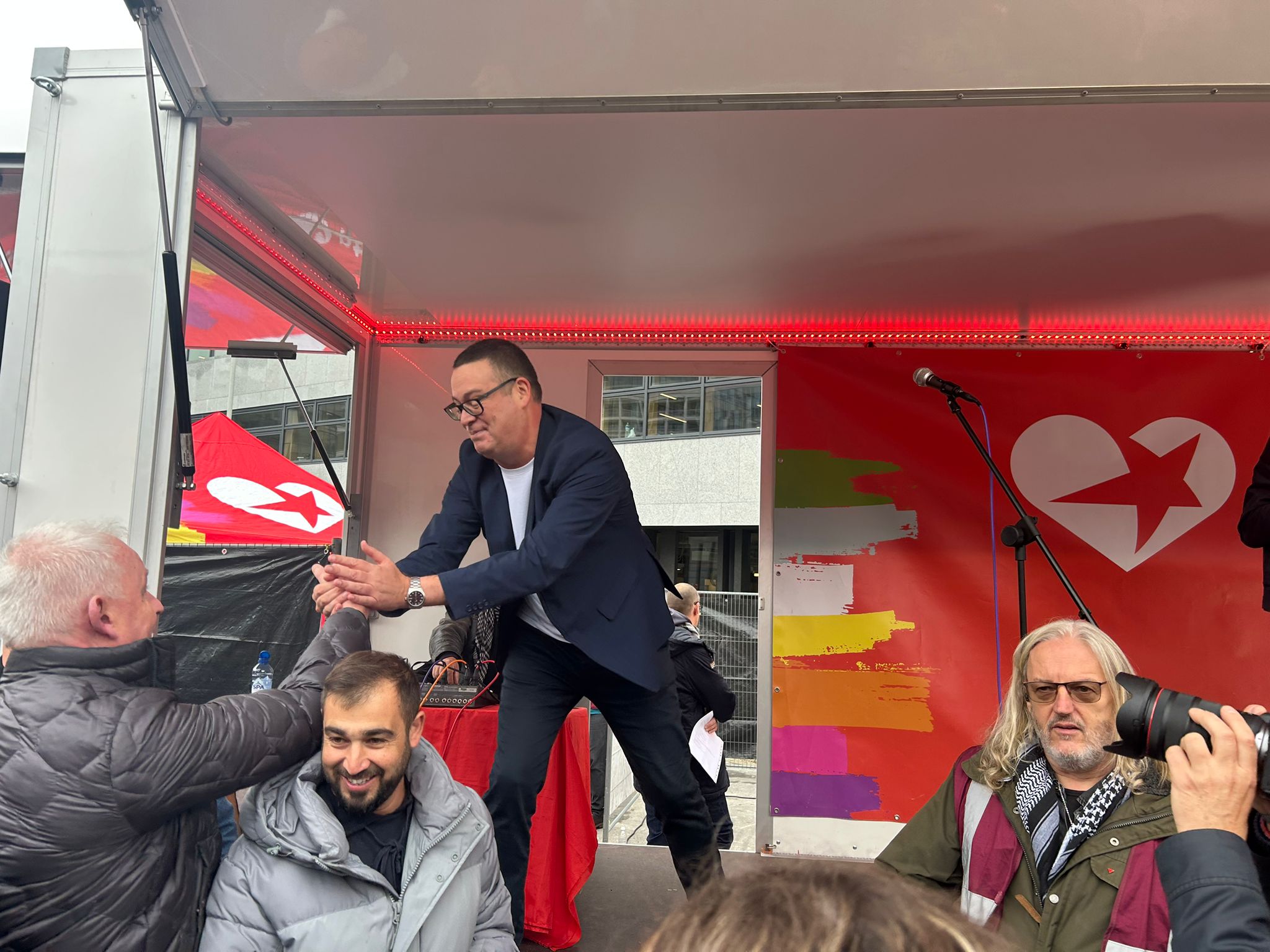 Our reporter spotted PTB-PVDA leader, Raoul Hedebouw, being welcomed into the party's tent in Brussels "like a hero."