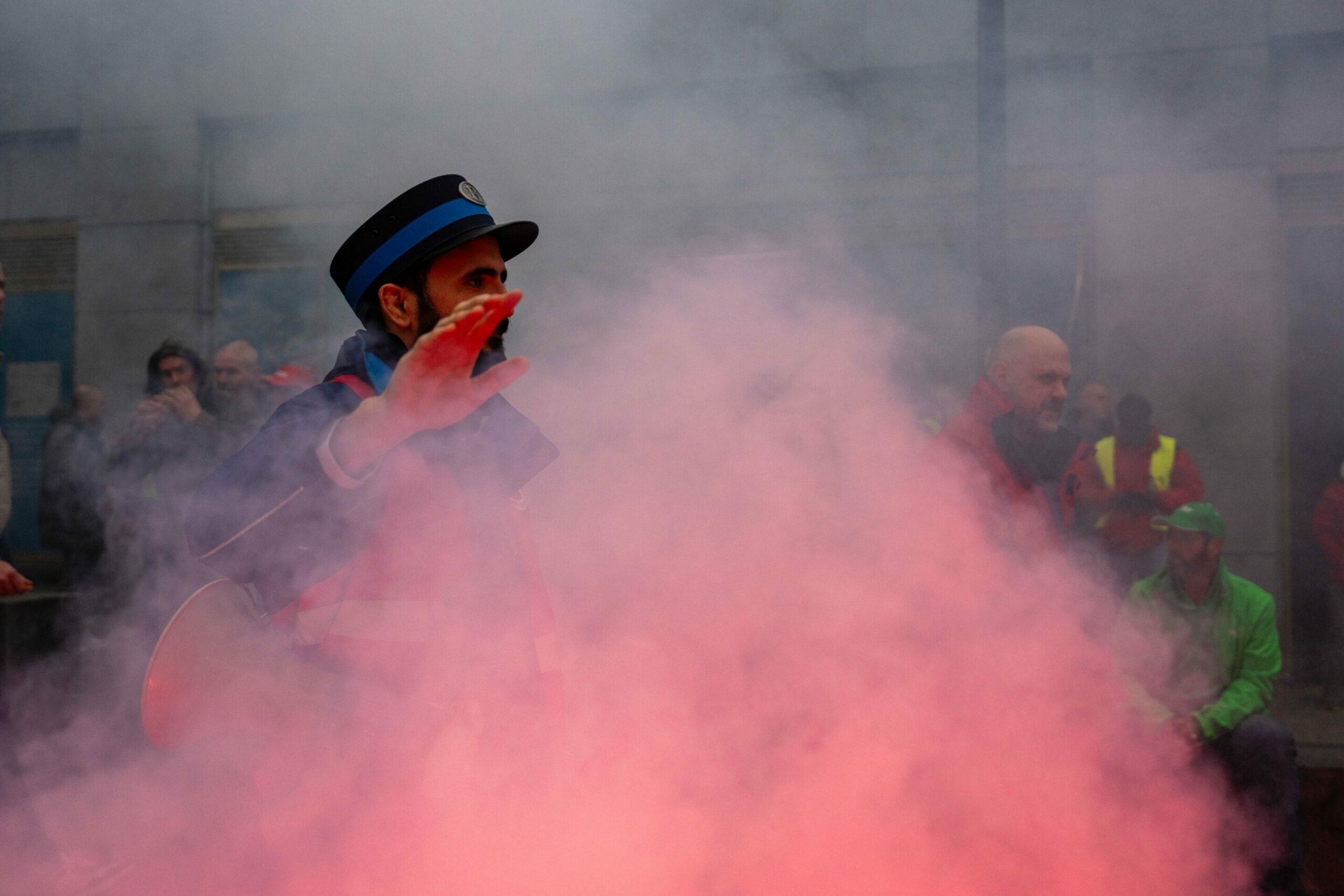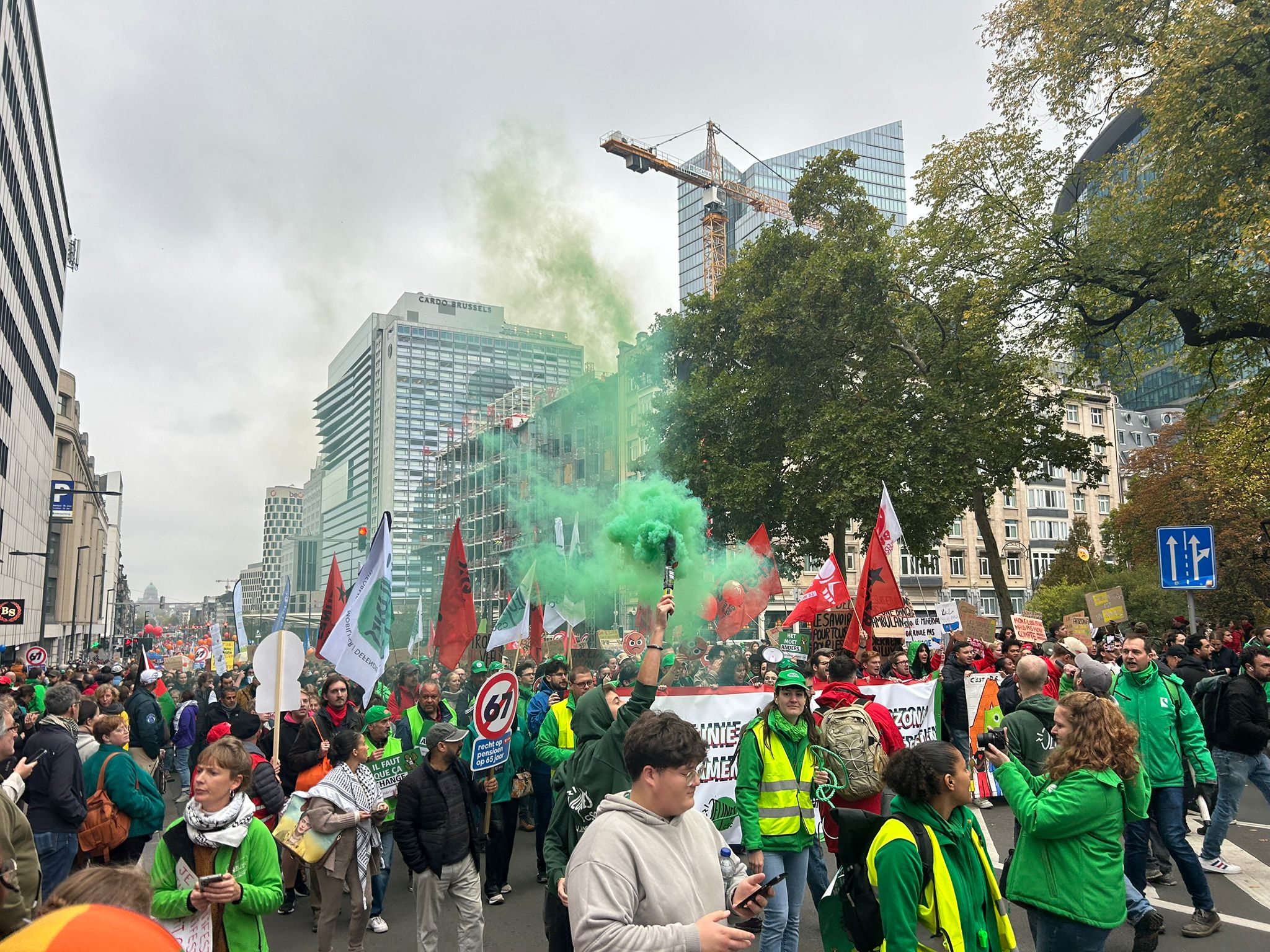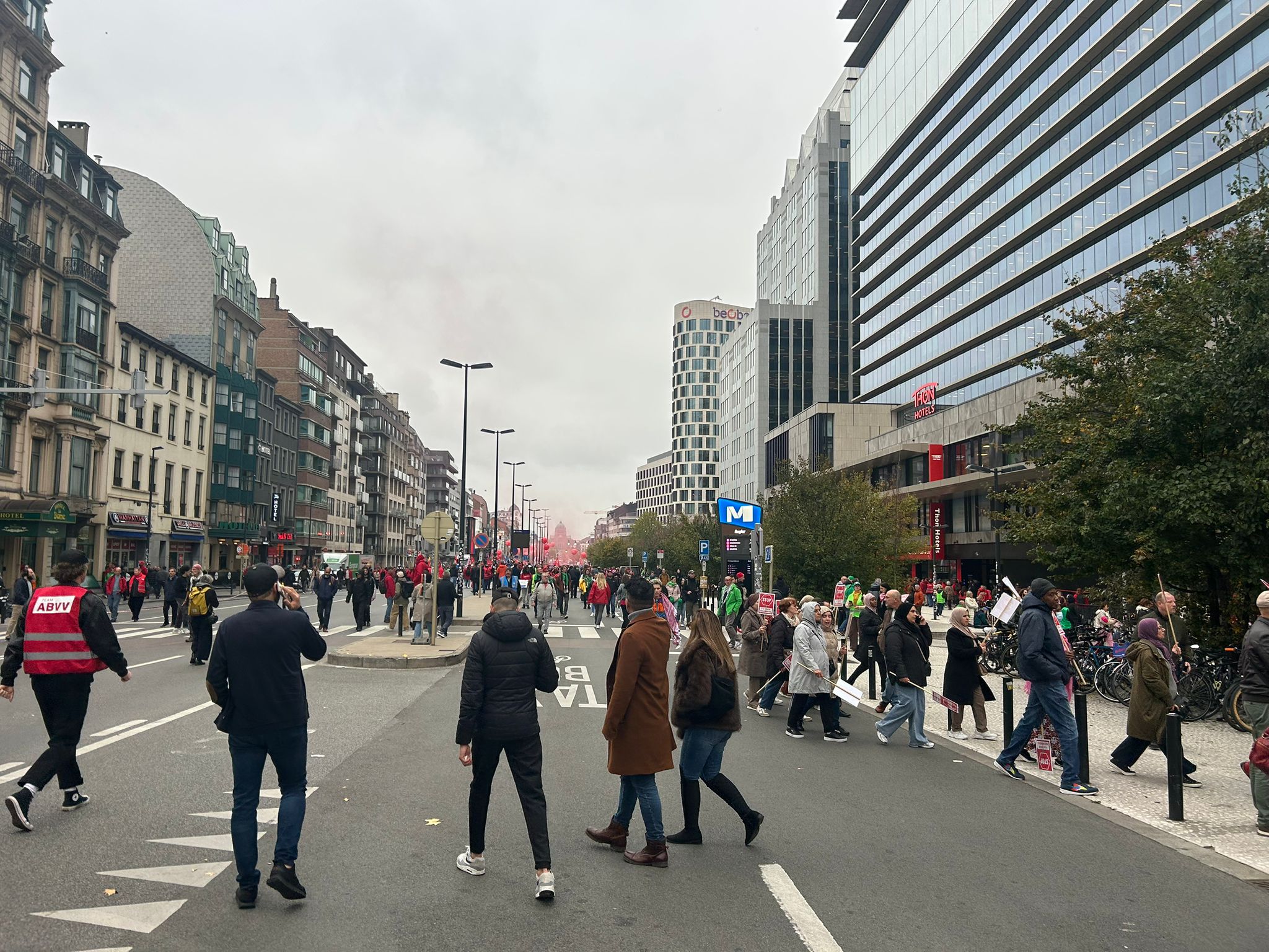 Red smoke can be seen near Brussels North station as protesters gather ahead of the start of the demonstration. Firecrackers can be heard occasionally, but the atmosphere remains calm, reports Aurore Spitaels.