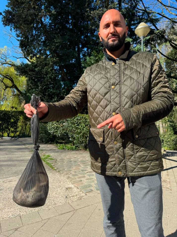 City of Brussels Councillor for Public Spaces Anas Ben Abdelmoumen with a rat in a bag