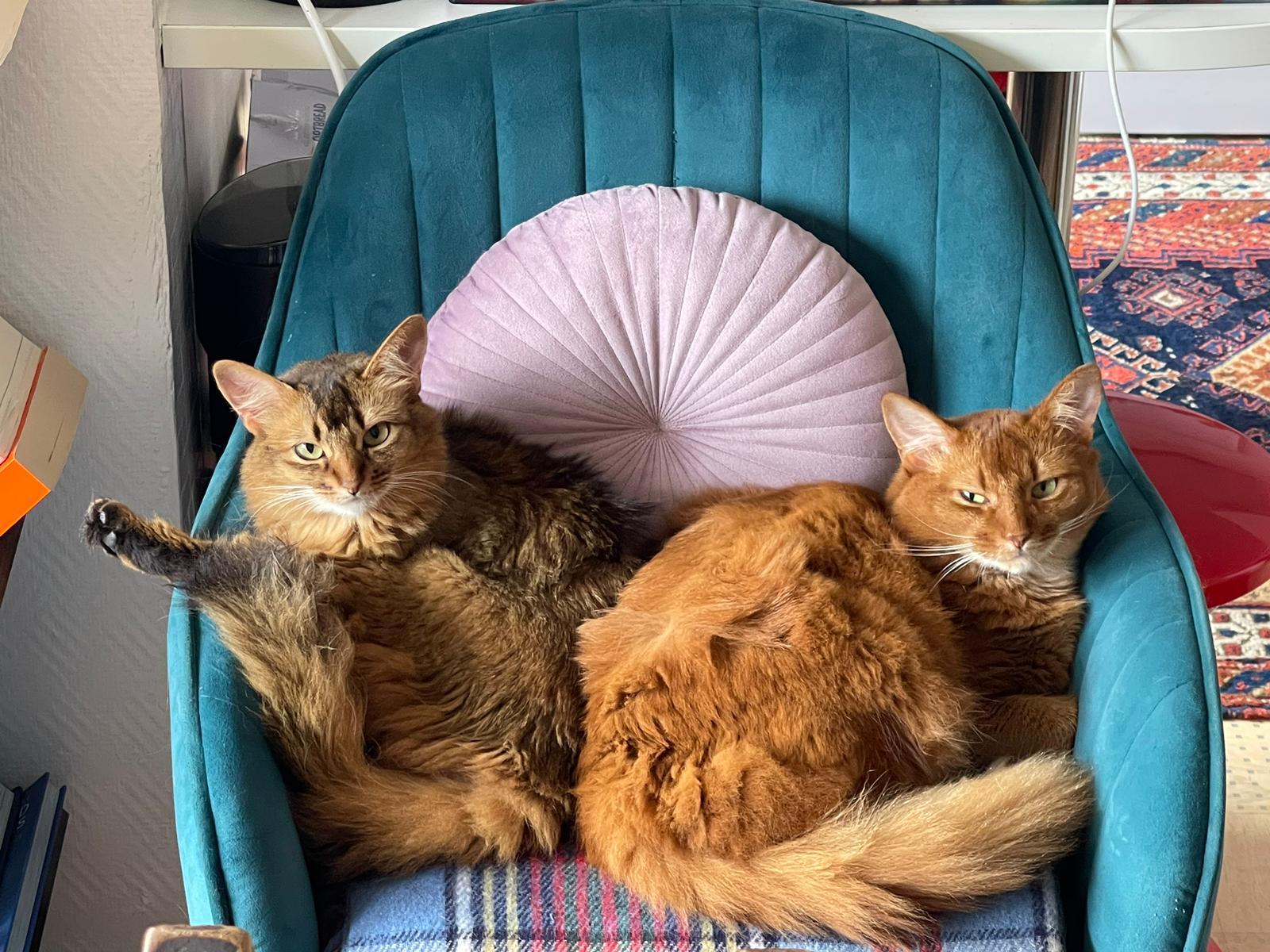 Artemis (left) and Apollon (right), chilling on a sofa. Credit: Anas El Baye