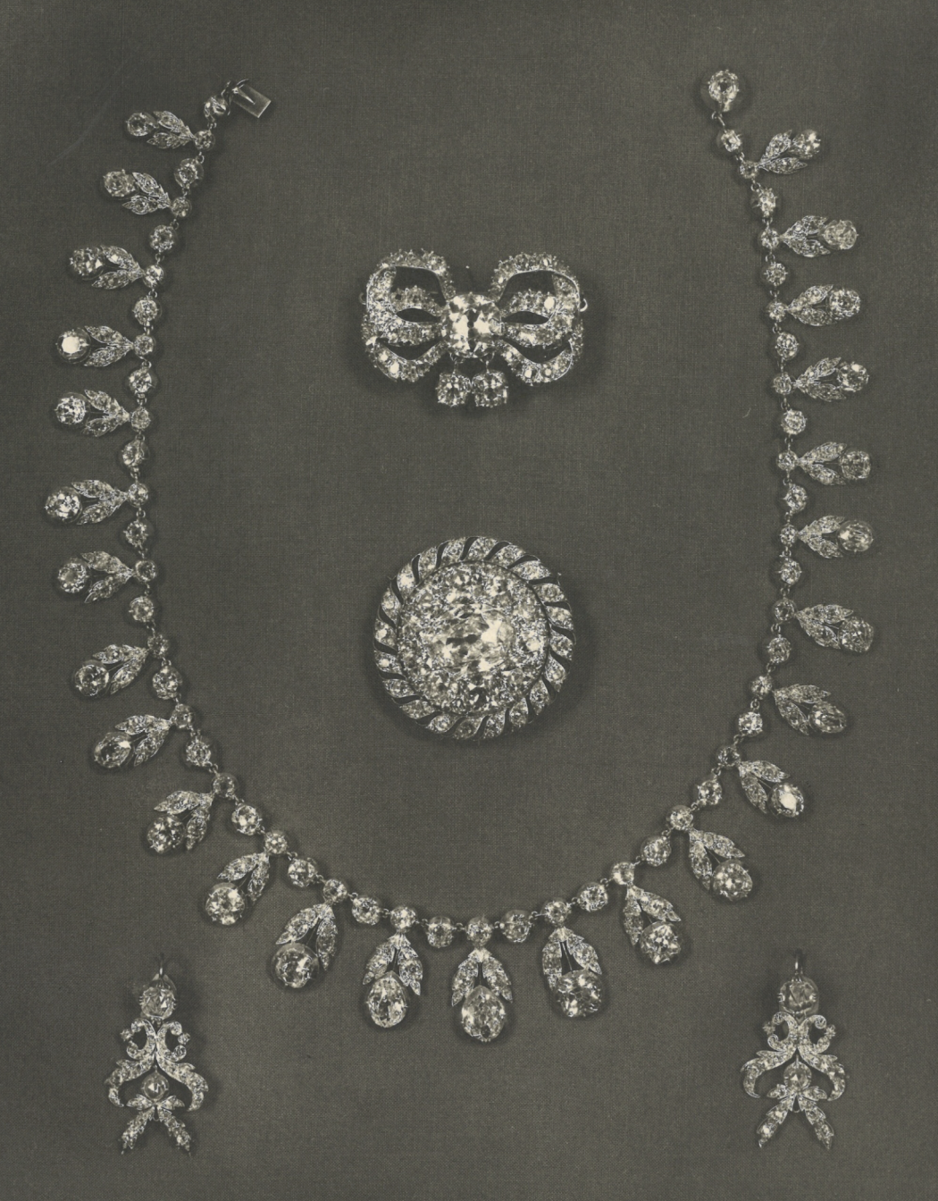 In 1913, the hat ornament is listed as part of a suite of jewels related to the diamonds found in Napoleon’s abandoned carriage at Genappe. These include the bow-shaped brooch mentioned above and a necklace, together with a pair of earring surmounts, seemingly missing their pendants.