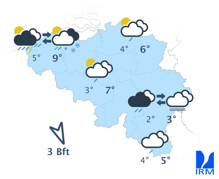As the day progresses, conditions will turn variable across low and central Belgium, with heavy cloud cover and scattered showers punctuated by occasional clear intervals. The chances of rain, thunder and sleet will be highest in the west.