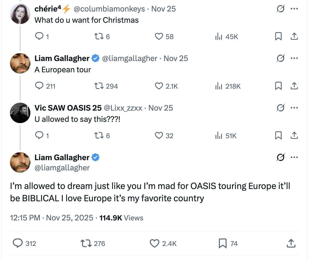 Another fan asks with "Are you allowed to say this?" to which Liam replies: "I’m allowed to dream just like you,” adding "I’m mad for Oasis touring Europe, it’ll be biblical" and "Europe is my favourite country".
