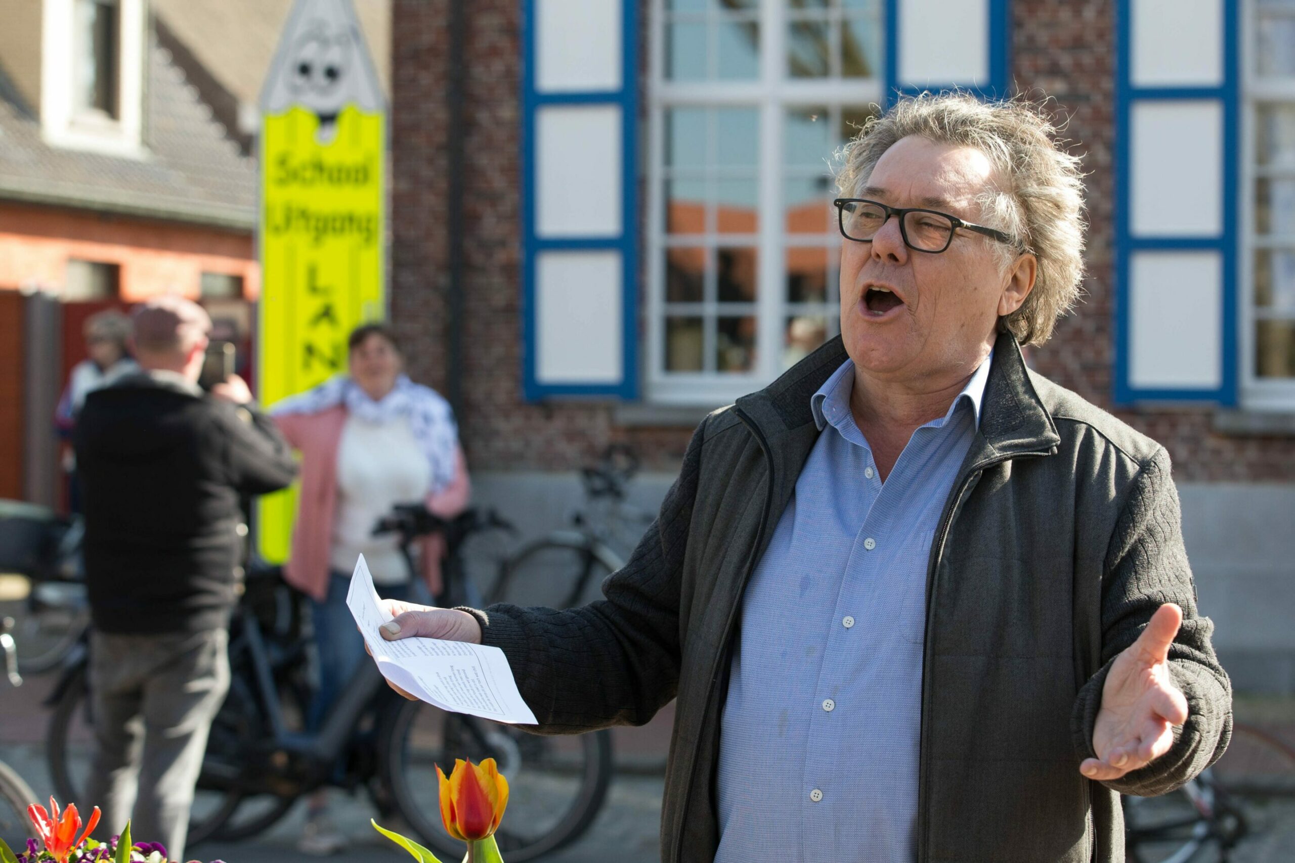 Johan Verminnen sings as residents of Hansbeke sing 'Mooie Corona-dagen', Sunday 05 April 2020. Flemish singer and resident of Hansbeke, Johan Verminnen adapted the text of his song 'Mooie dagen' to a song for the coronavirus crisis. Credit: Belga/ Nicolas Maeterlinck