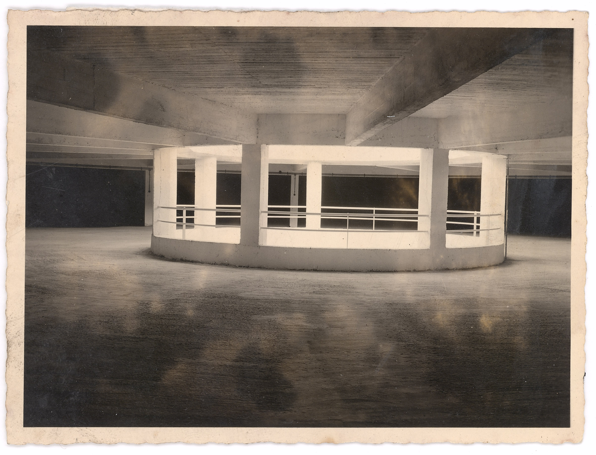 The exhibition displays the promotional leaflet for his 1955 Coliseum Residence, situated on a sharp slope on Chaussée de Boondael opposite Ixelles Cemetery (where Delhaye had designed the Horta family tomb pro bono in 1950). It crams in a car workshop, apartment building and 12-metre high circular parking garage with a diameter of 39 metres that rises just 2.75 metres above ground level by taking advantage of the change of level.
