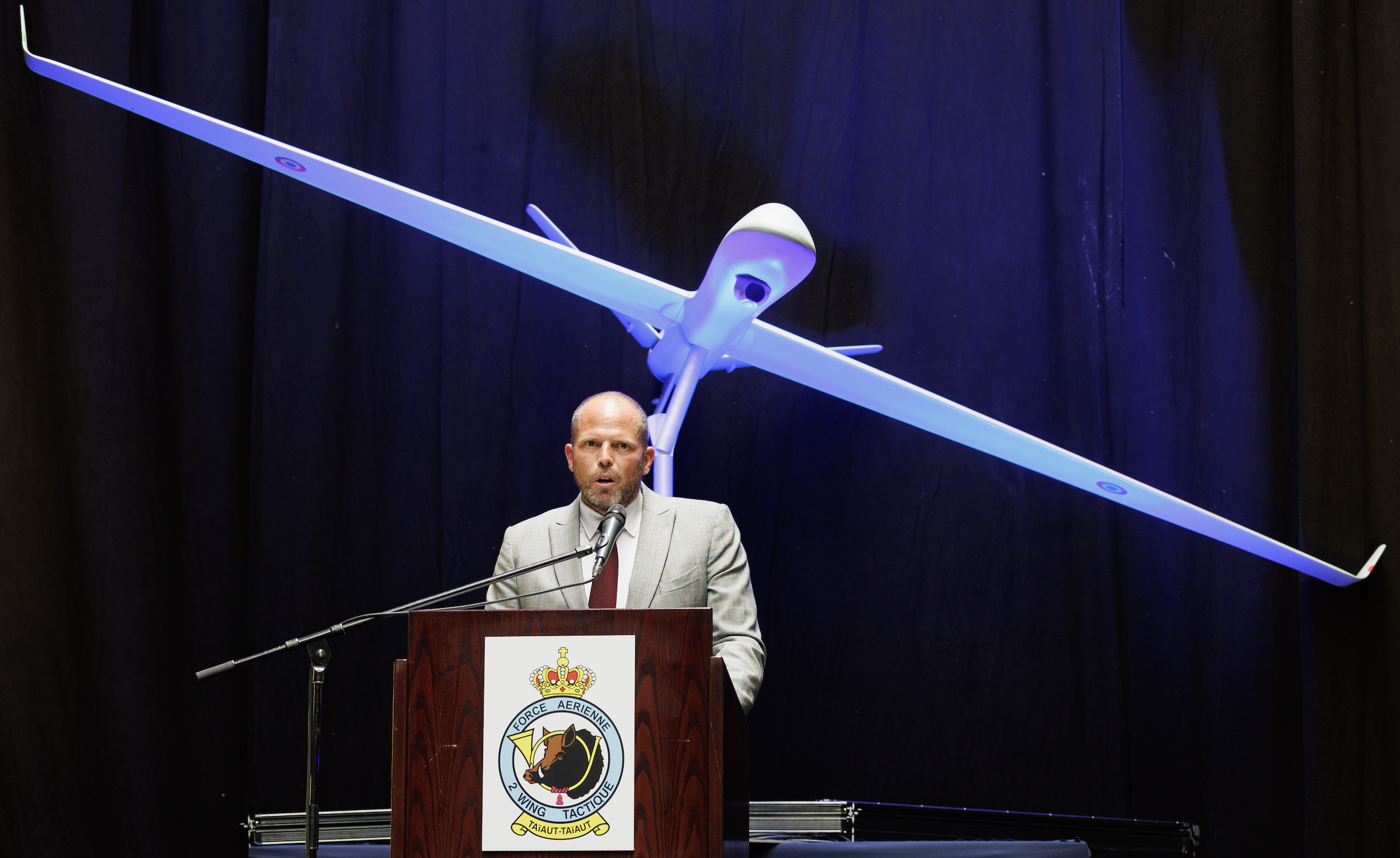 Belgium's Minister of Defence and Foreign Trade Theo Francken pictured during the presentation of the MQ-9B 'SkyGuardian' at the Florennes airbase, Tuesday 23 September 2025. Credit: Belga / Benoit Doppagne