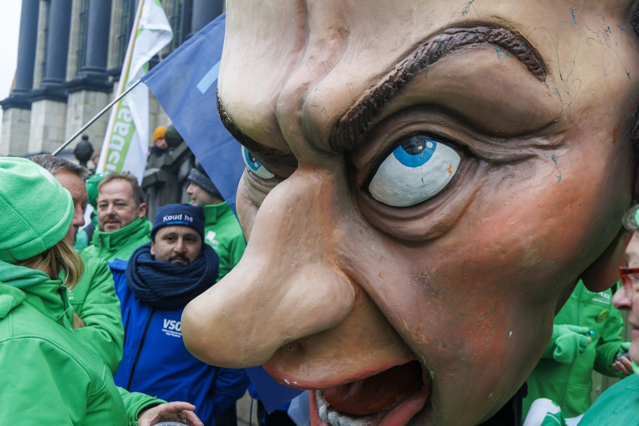 A caricature of Prime Minister De Wever pictured at a march of workers called by unions to denounce the consequences of federal government measures, in Gent, on Tuesday, 25 November 2025. Credit: Belga/Nicolas Maeterlinck.