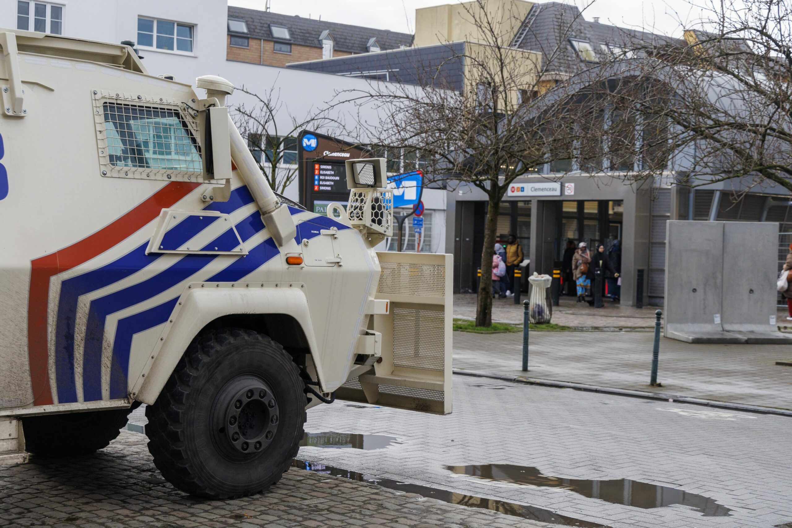 Police pictured near the Clemenceau metro station during 'Pause 1070' a solidarity neighbourhood meeting in Anderlecht, Brussels, on Thursday 27 February 2025, after the recent shootings in their neighbourhood. Credit: Belga/Nicolas Maeterlinck
