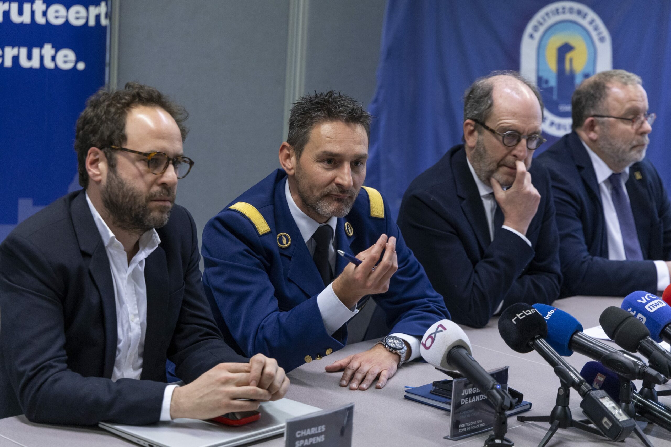 Forest mayor Charles Spapens, Jurgen De Landsheer, chief of the Brussels Midi/ Zuid police zone, Anderlecht mayor Fabrice Cumps and Saint-Gilles - Sint-Gillis mayor Jean Spinette pictured during a press briefing by the Brussels-Midi/ Zuid police zone on the incidents of the last few days in Anderlecht, Brussels, on Thursday, 20 February 2025. There have been several shootings in Brussels since the beginning of February, in which two people have been killed and at least three injured. Authorities have linked most of the gunfire to drug trafficking and disputes between gangs attempting to gain territory. Credit: Belga/Nicolas Maeterlinck.