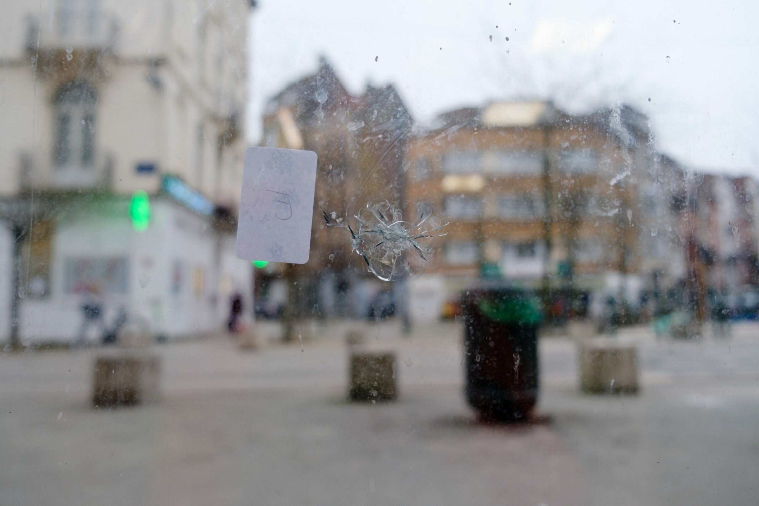 A close-up on a bullet impact on a window of the Quatre Saisons school in Bethleem place in Saint-Gilles - Sint-Gillis, Brussels, Wednesday 08 October 2025. During the night between Wednesday and Thursday, several shots were fired at Place de Bethléem, hitting the Les Quatre Saisons municipal school. One bullet lodged in the frame of the office window, and another remained stuck in the double glazing of a classroom window. Credit: Belga/Eric Lalmand