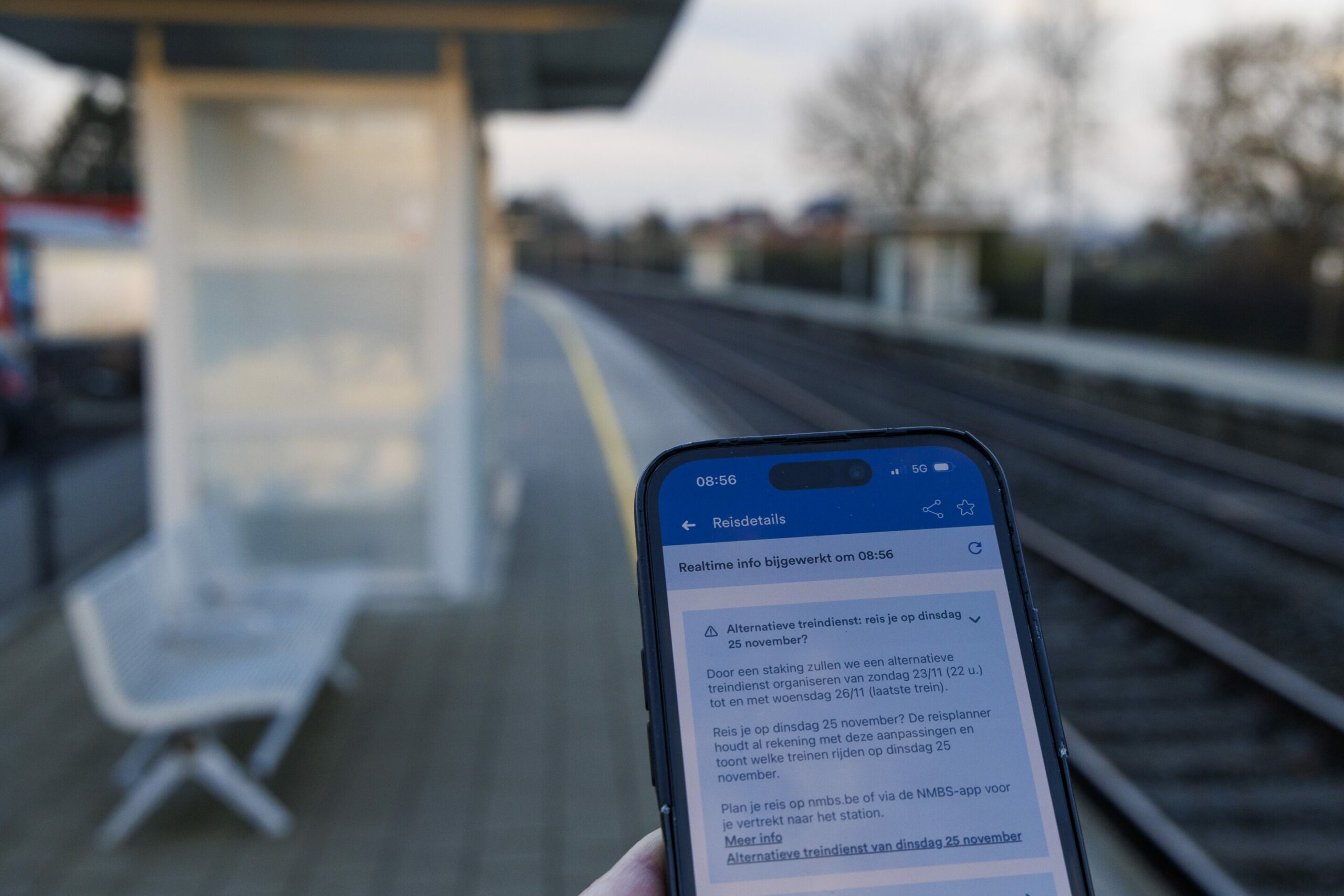 The mobile application of the NMBS pictured showing a strike message during the national strike to denounce the consequences of federal government measures, in Lierde, on Tuesday 25 November 2025. Credit : Belga/Nicolas Maeterlinck