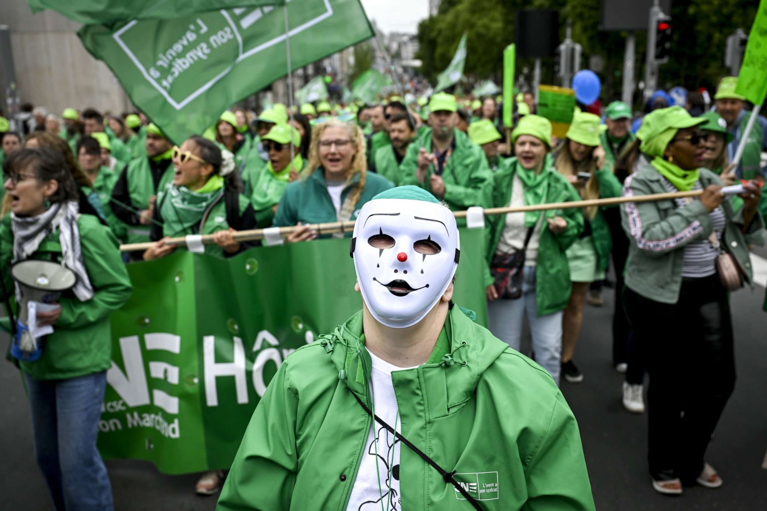 Union members gather for a protest action of the non-profit sector, organised by the trade unions in Brussels on Thursday 22 May 2025. Credit: Belga/Dirk Waem