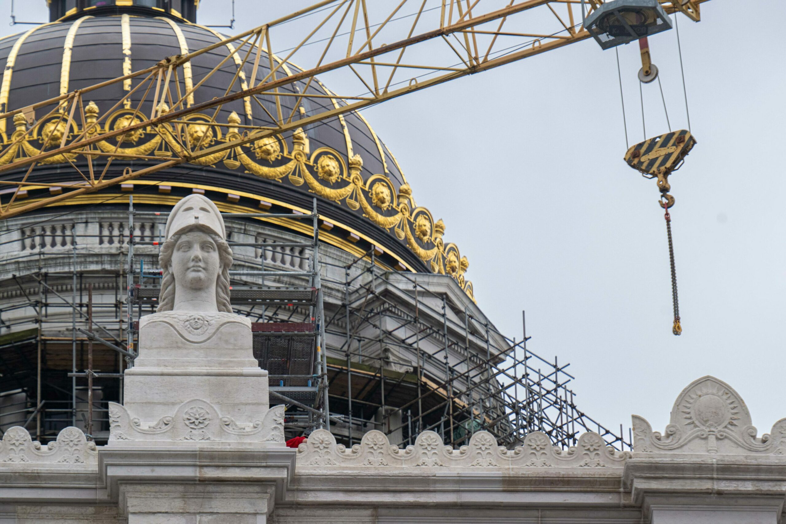 A statue of Minerva is seen during the inauguration of the first renovated part of the facade of the Brussels Justice Palace and of the Minerva statue, in Brussels, Friday 24 May 2024. Credit: Belga