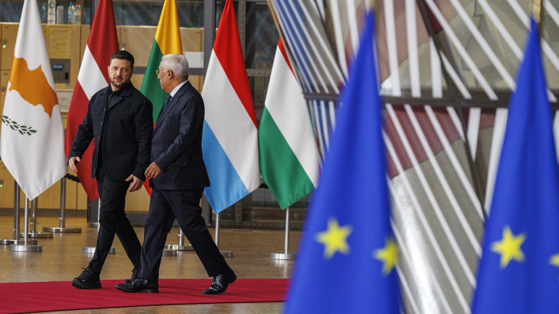Ukraine president Volodymyr Zelensky and European Council President António Costa pictured ahead of a European council summit (23-24/10), in Brussels, Thursday 23 October 2025. Credit: Belga