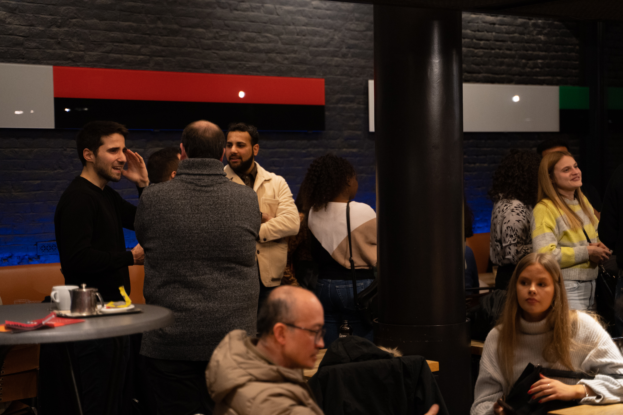 Attendees share drinks and conversations at the weekly meetup. Credit: Vicente Torre Hovelson/ The Brussels Times.