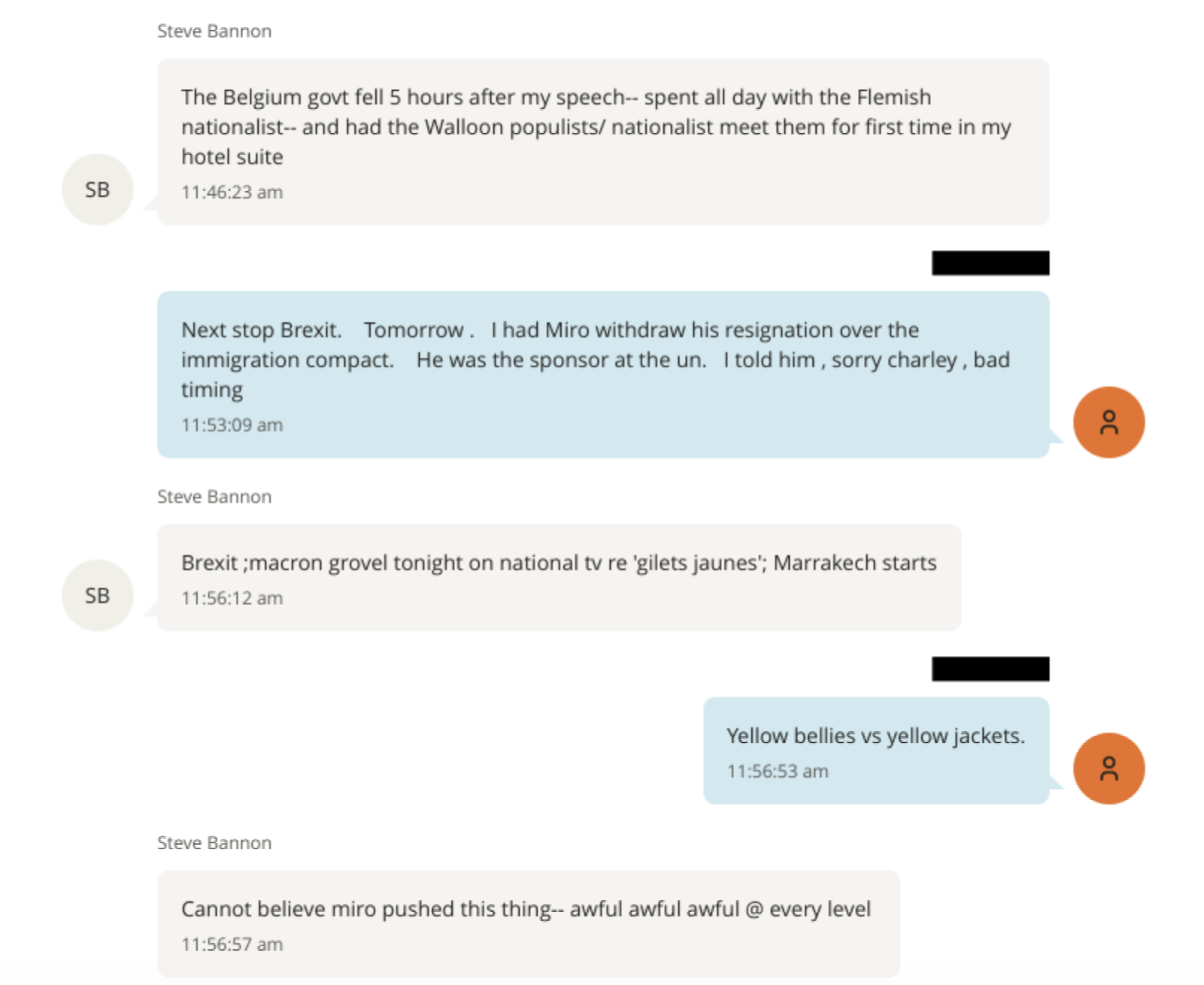 There are many references to Bannon's work in setting up a far-right movement in Europe to undermine the EU and the UN migration pact, which was being vehemently discussed at the time.