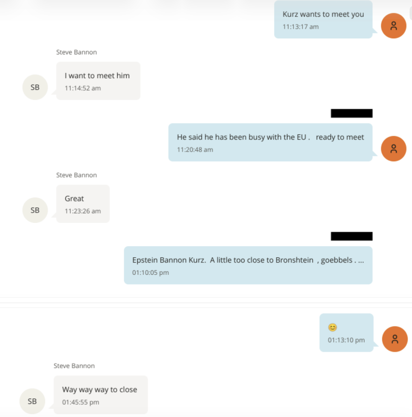 In the text exchanges, Bannon expresses willingness to meet him. Epstein replies with: "Epstein, Bannon, Kurz.. A little too close to Bronsthein, goebbels…"