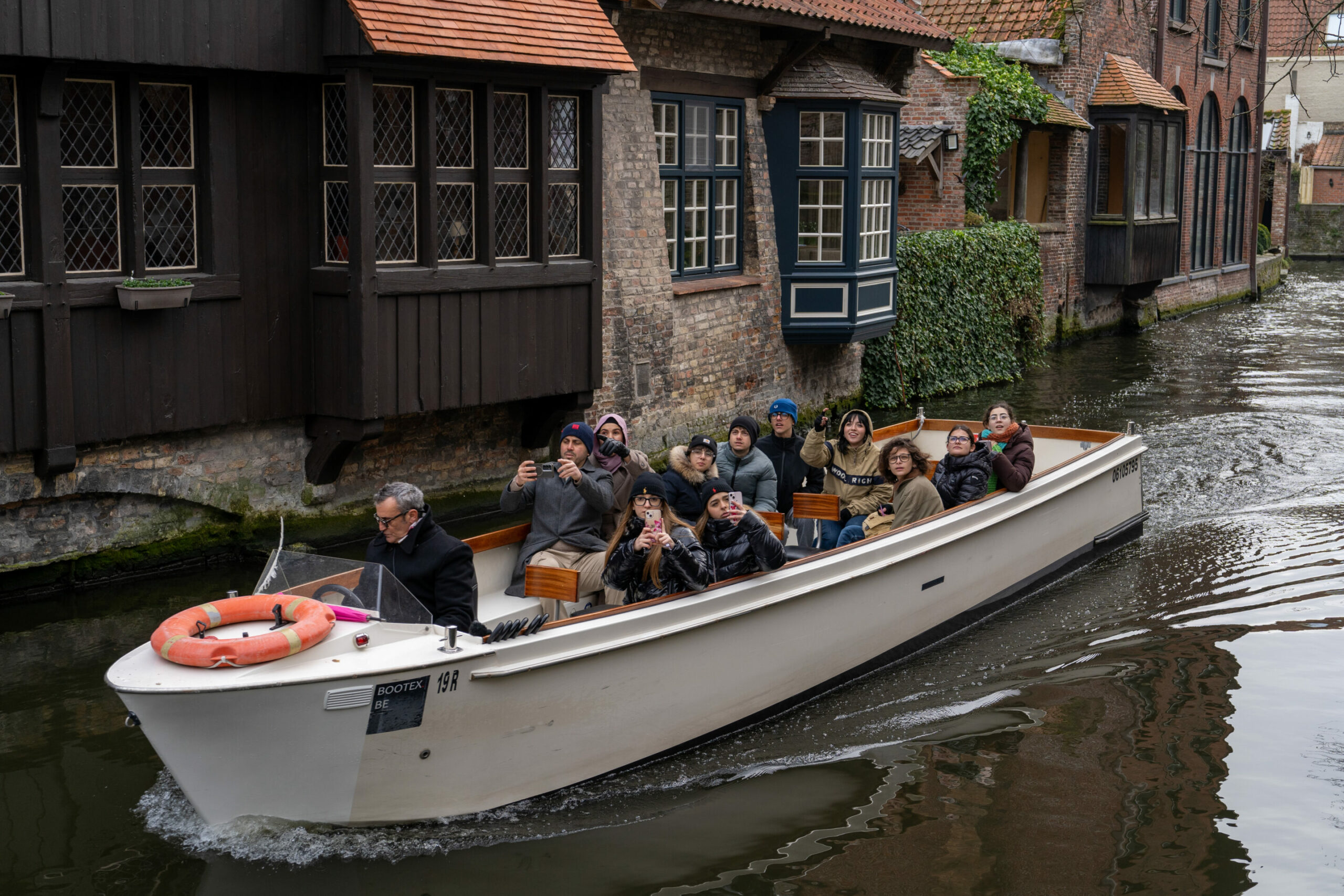 A boat tour gliding through a canal in Bruges, Belgium. Credit: Vicente Torre Hovelson/ The Brussels Times.