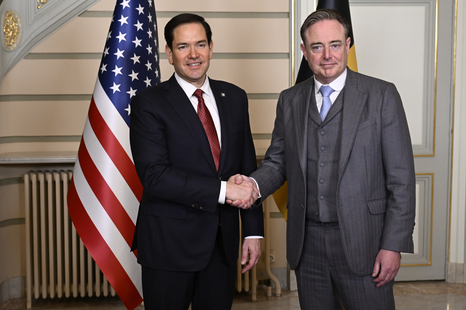 US Secretary of State Marco Rubio and Belgian Prime Minister Bart De Wever shake hands during a meeting in Brussels in April 2025. Credit: Dirk Waem/Belga