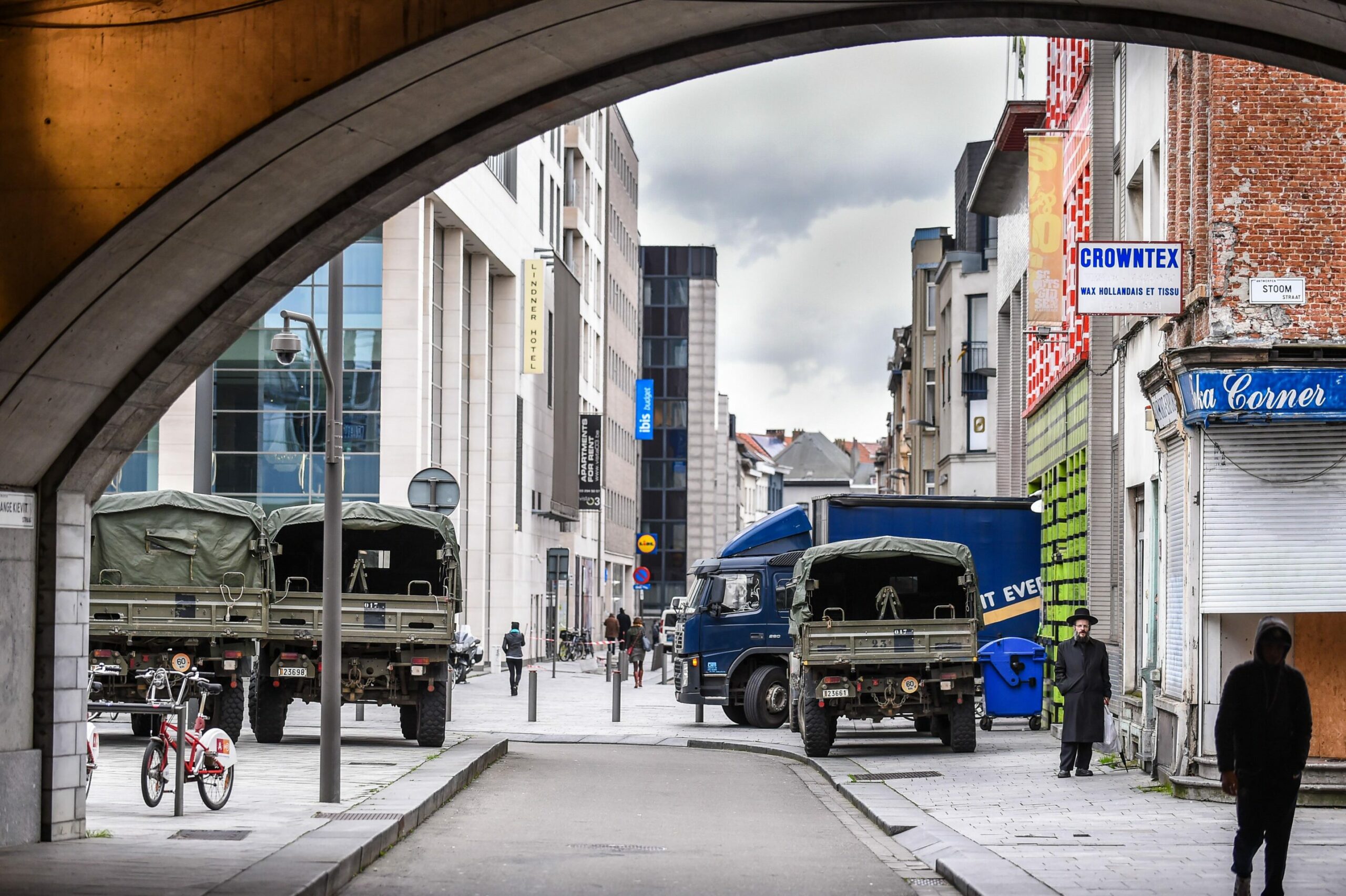 Illustration picture shows army trucks in the Jewish neighbourhood close to the Antwerp Centraal railway station in Antwerp, Friday 20 November 2015. Credit: Belga