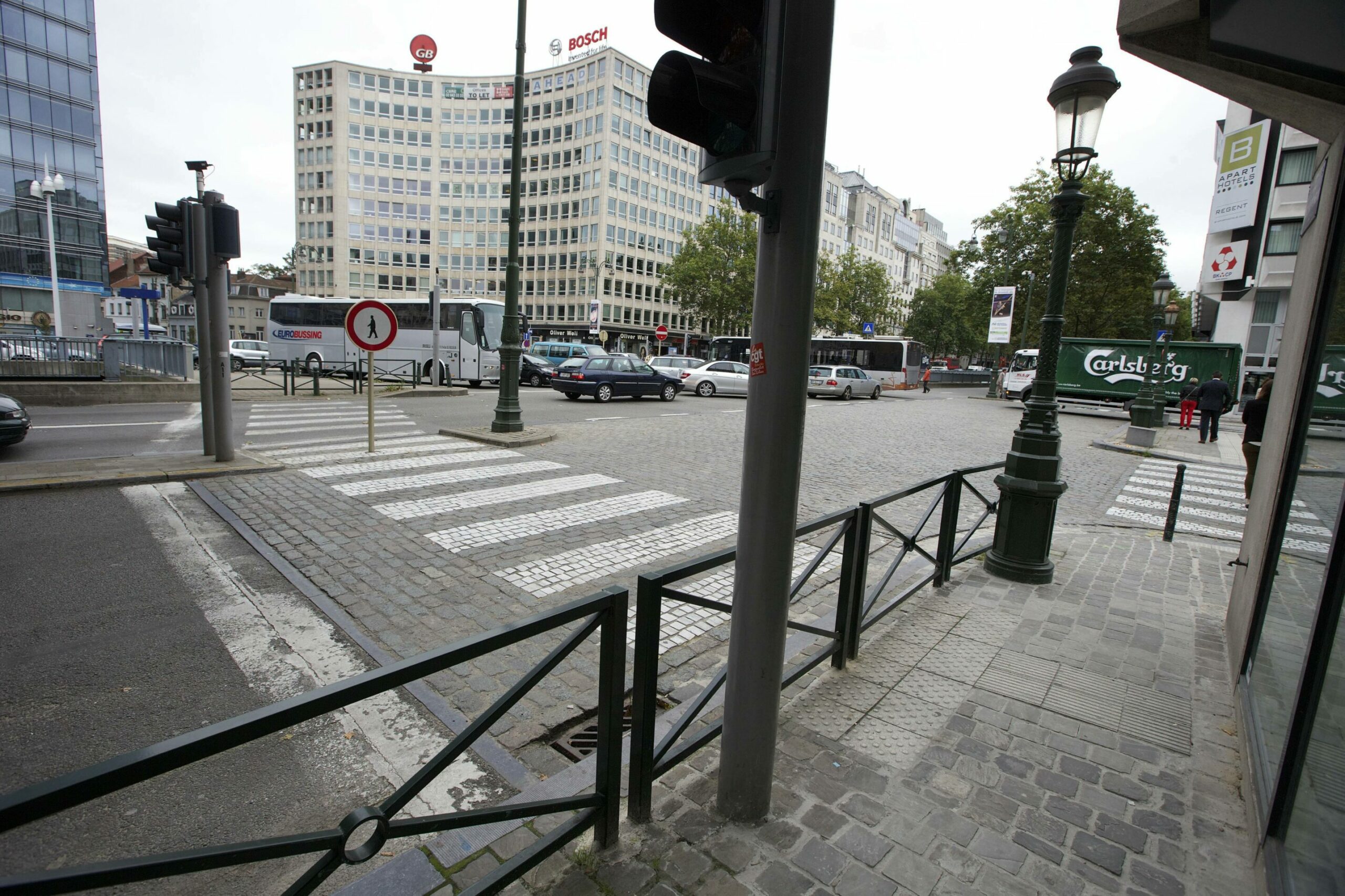 Illustration pictures shows a prohibitory sign and fence at the zebra crossing at the Brussels Place de Surlet de Chokier, near Madou, Thursday 28 August 2014. Credit: Belga