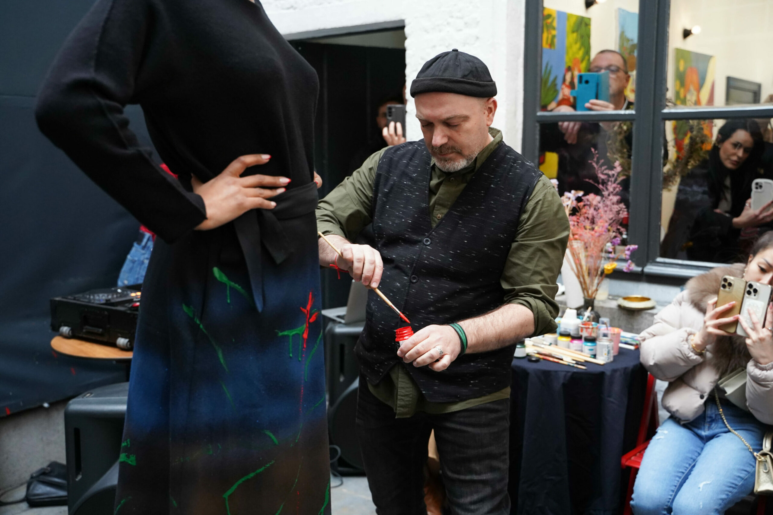 Dastid Miluka painting Kedist Deltour’s dress at Balkan sustainable fashion week. Credit: Vicente Torre Hovelson.