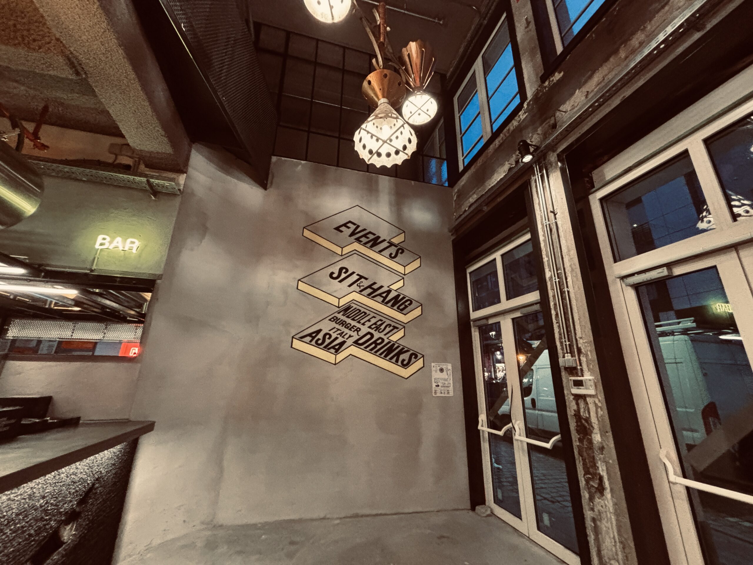 Concrete exposed. Paint cracked. Light hangs unevenly from industrial fixtures. A voyage into the culinary street food culture of Asia and the Middle East, with an urban rundown – all purposefully conceived by Goor.