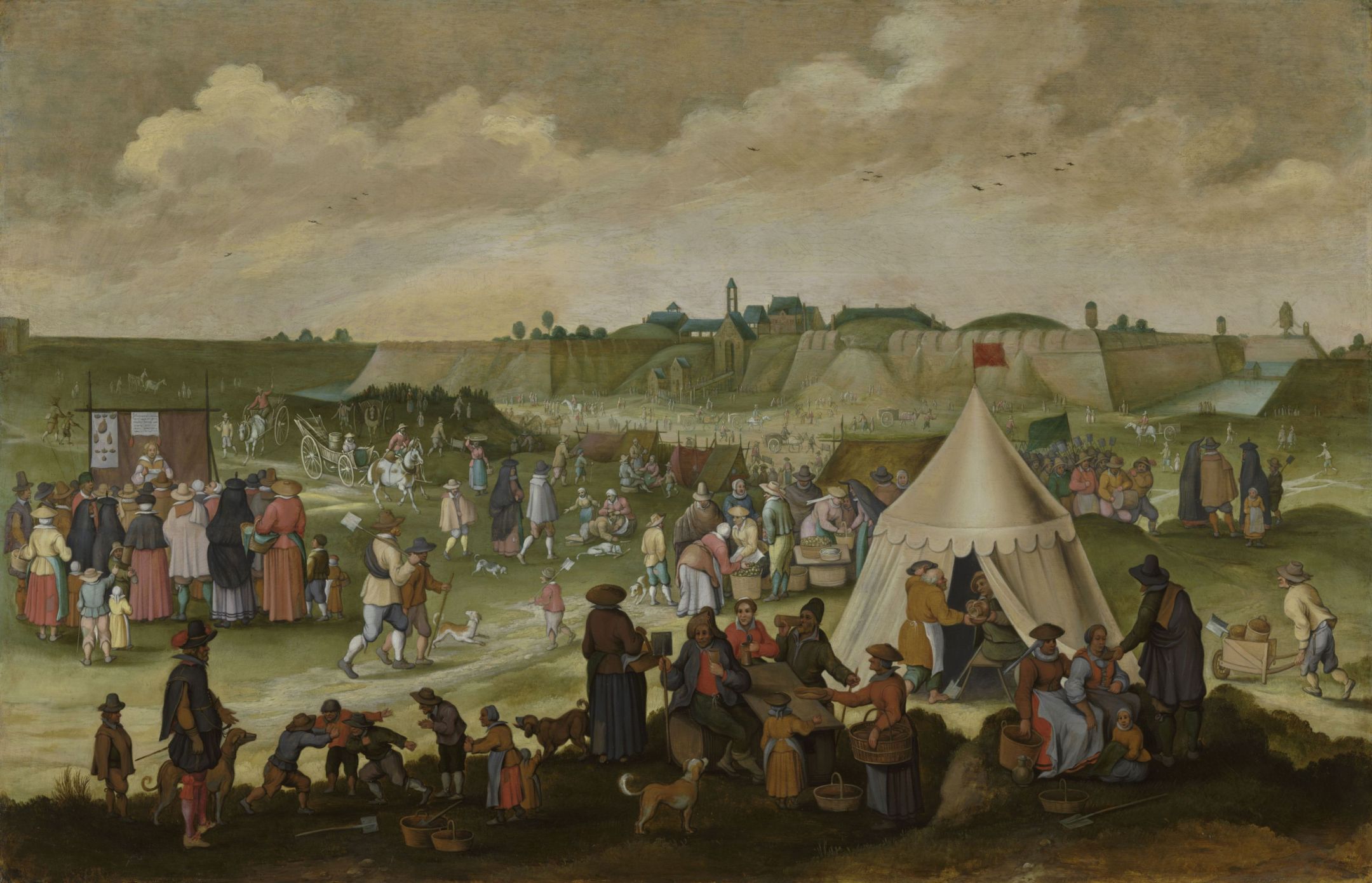 An earlier composition appears to have presented the demolition in more celebratory tones. By the time the painting was altered – when Antwerp was again under Spanish control and the fortress had been rebuilt – new figures were inserted. Most striking is a quack doctor operating on the margins of the scene. Above him hang bladder stones, once displayed as proof of miraculous cures. In this context, they function as loaded symbols. Is the fall of the citadel a purging of disease from the body politic? Or is it a dangerous illusion, peddled by charlatans and reckless leaders?