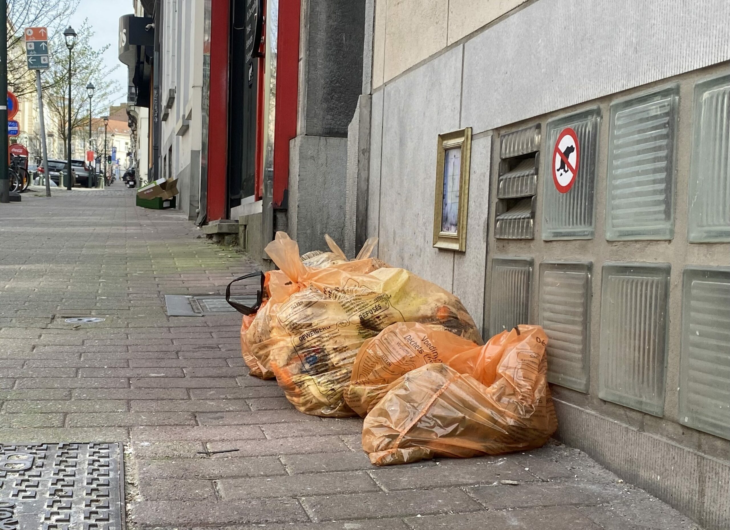 Orange bags out in the street on a Tuesday, when collection day is Thursday. Credit: The Brussels Times