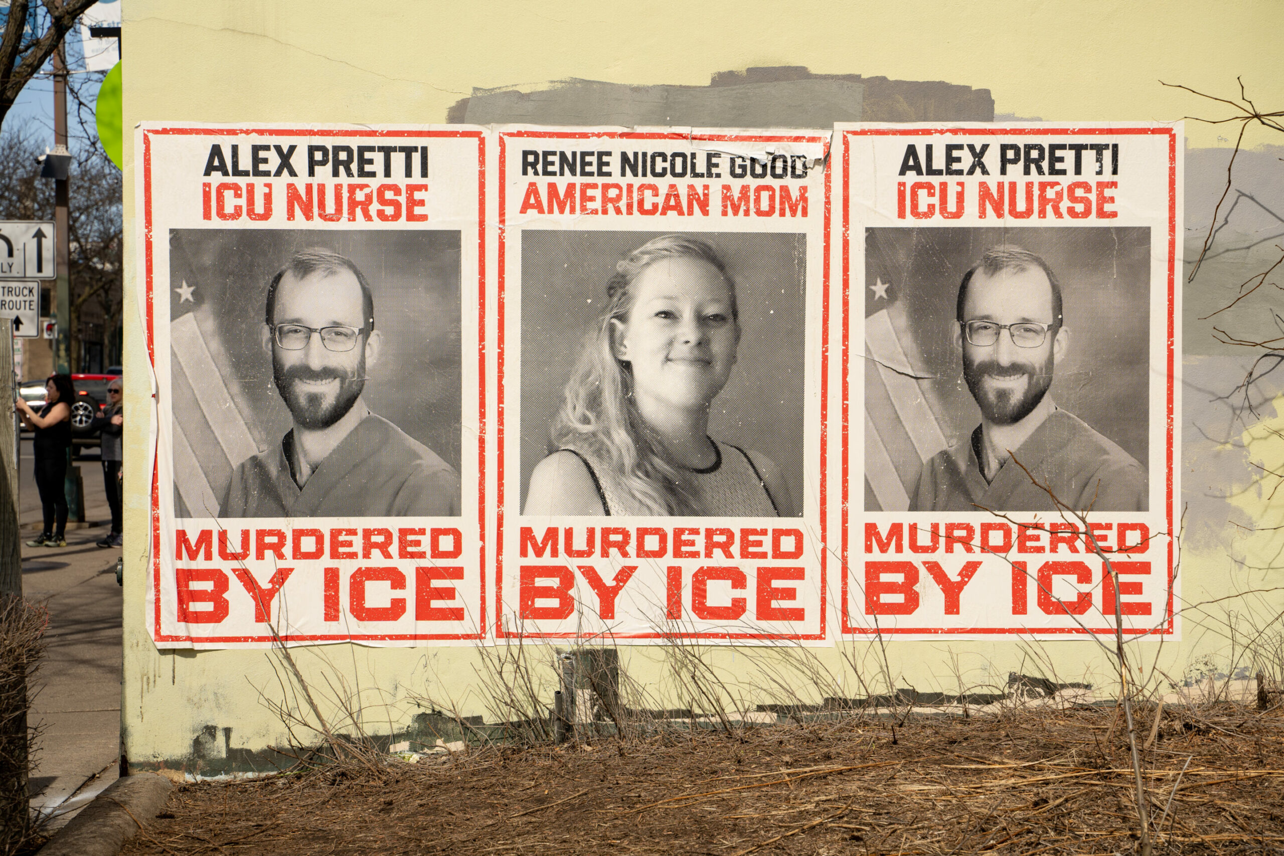 Posters with photos of Renee Good and Alex Pretti were pasted on a local business on “Eat Street” close to where Pretti was killed in an altercation with ICE. Credit: Vicente Torre Hovelson/ The Brussels Times.