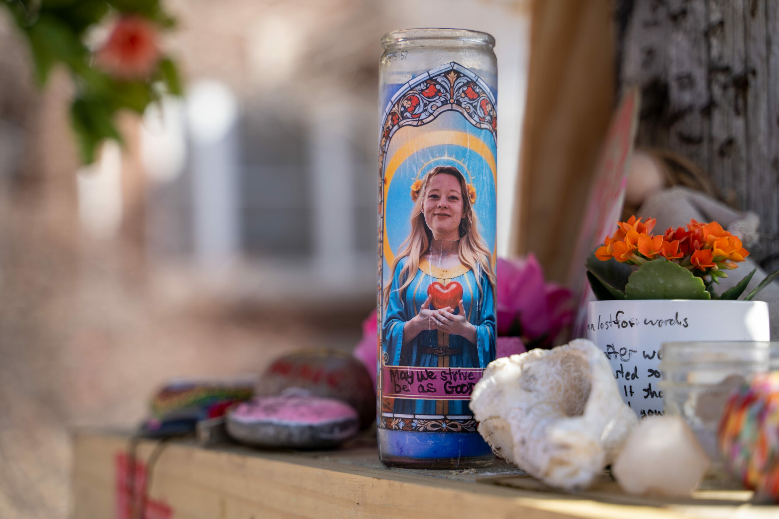 A Latin-style prayer candle depicting Renee Good as a saint at her memorial in Minneapolis, Minnesota. Credit Vicente Torre Hovelson/ The Brussels Times.