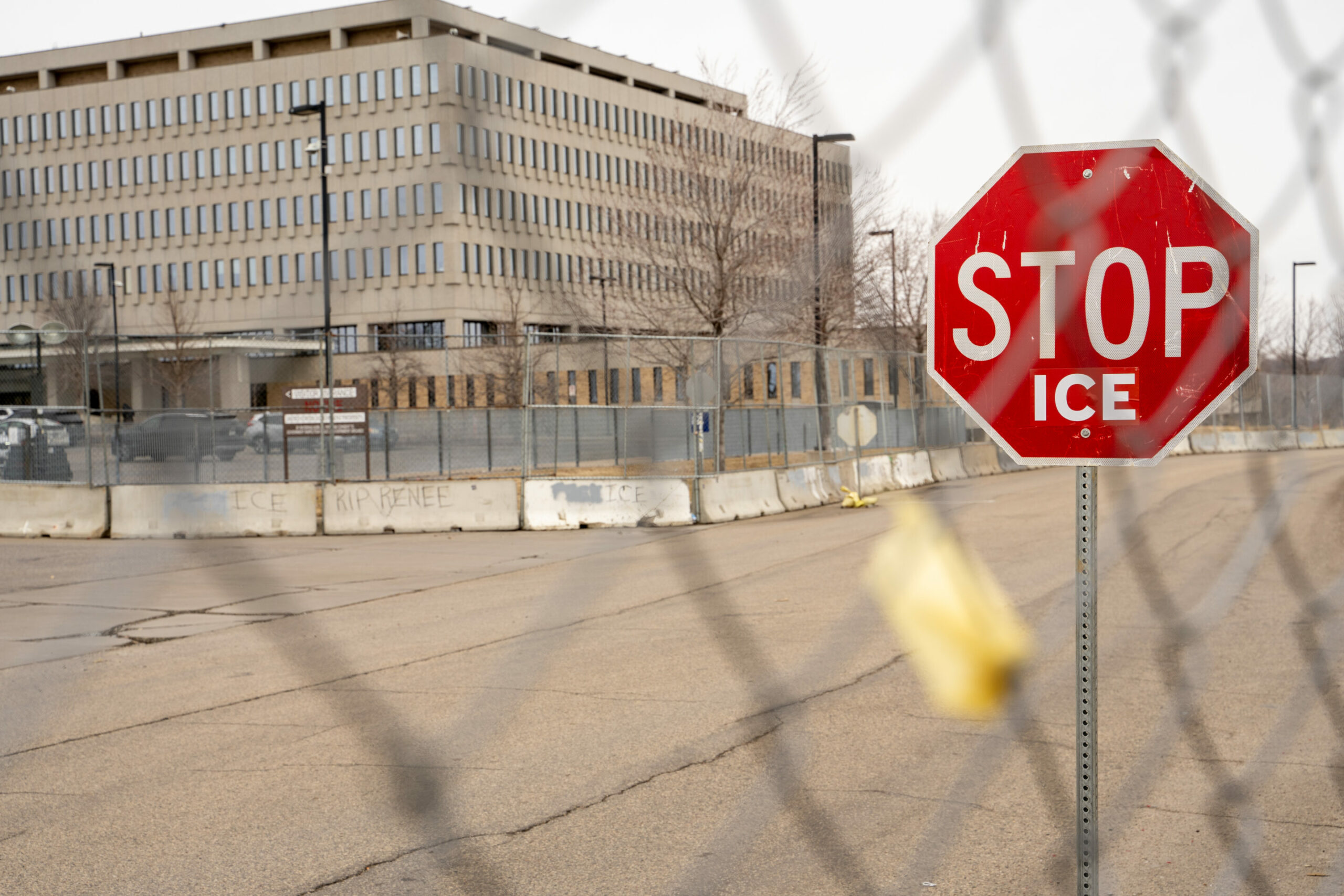 A photo of a stop sign in front of the Whipple government building in Saint Paul, Minnesota, which protesters altered to read “Stop Ice.” Credit: Vicente Torre Hovelson/ The Brussels Times.