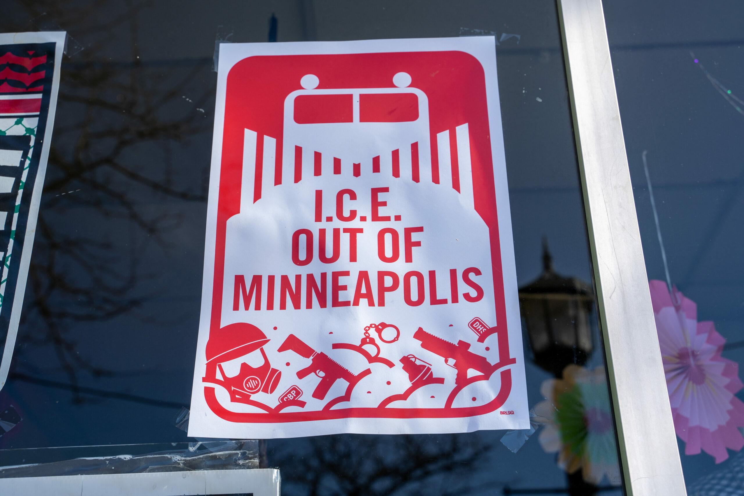 A sign on a local business across the street from where Alex Pretti died, which reads "I.C.E OUT OF MINNEAPOLIS" Credit: Vicente Torre Hovelson/ The Brussels Times.