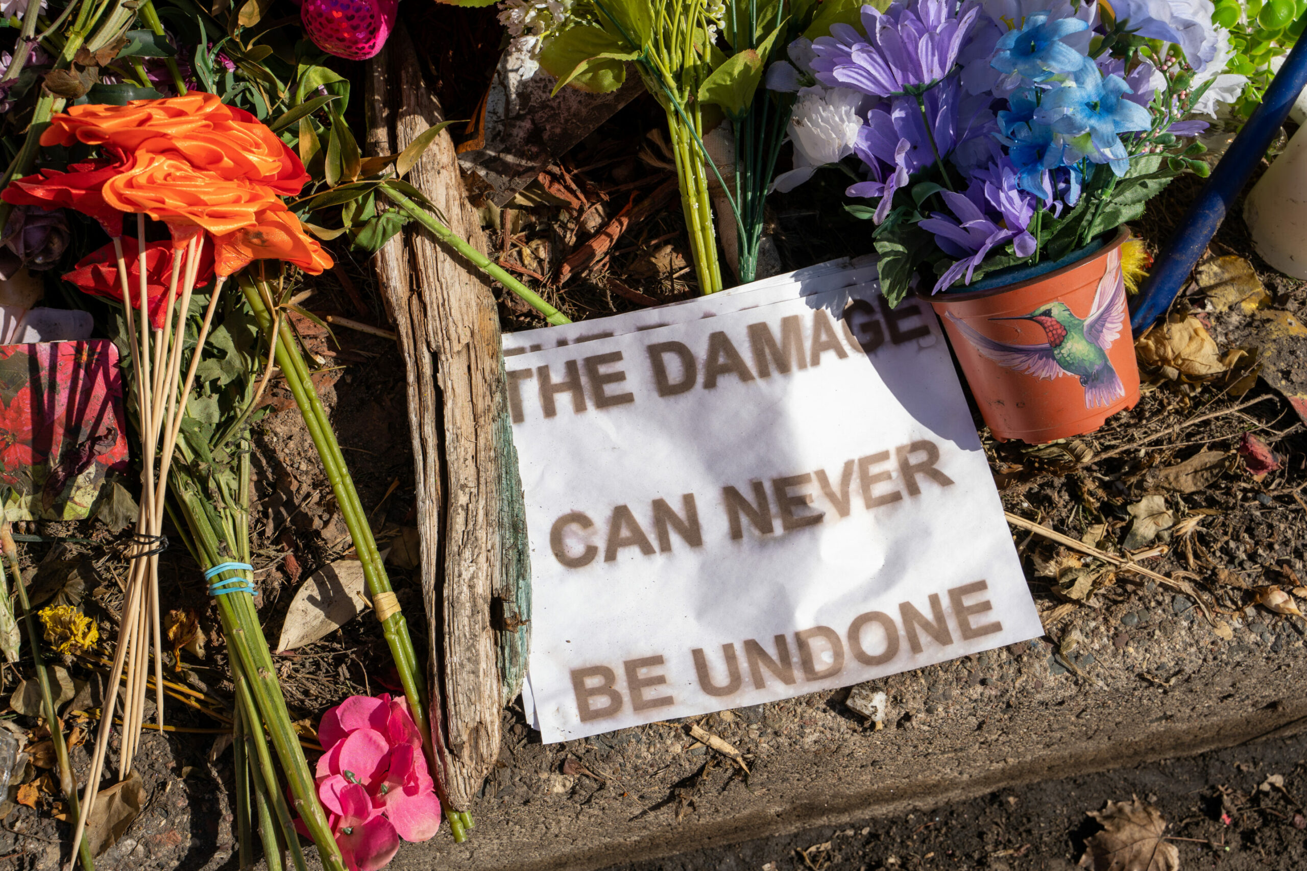 A sign at Renee Good's memorial which reads "THE DAMAGE CAN NEVER BE UNDONE." Credit: Vicente Torre Hovelson/ The Brussels Times.