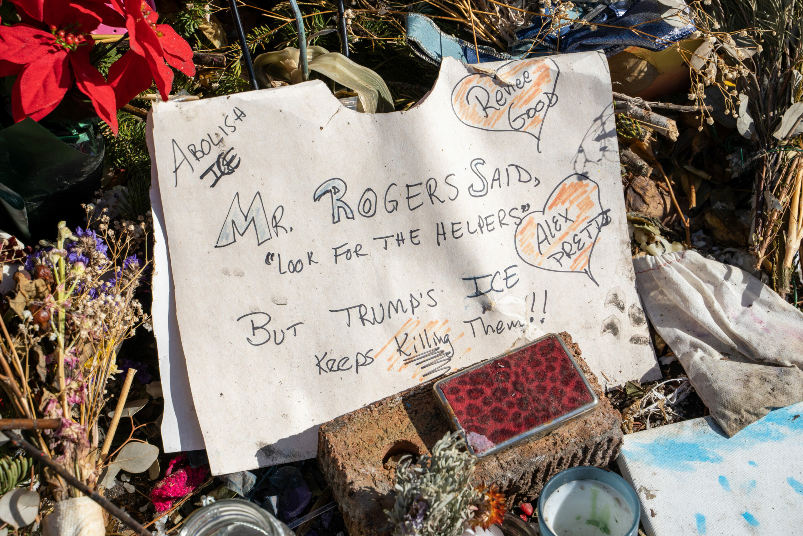 A sign was left at the scene where Renee Good was killed in an altercation with ICE. Credit: Vicente Torre Hovelson/ The Brussels Times.