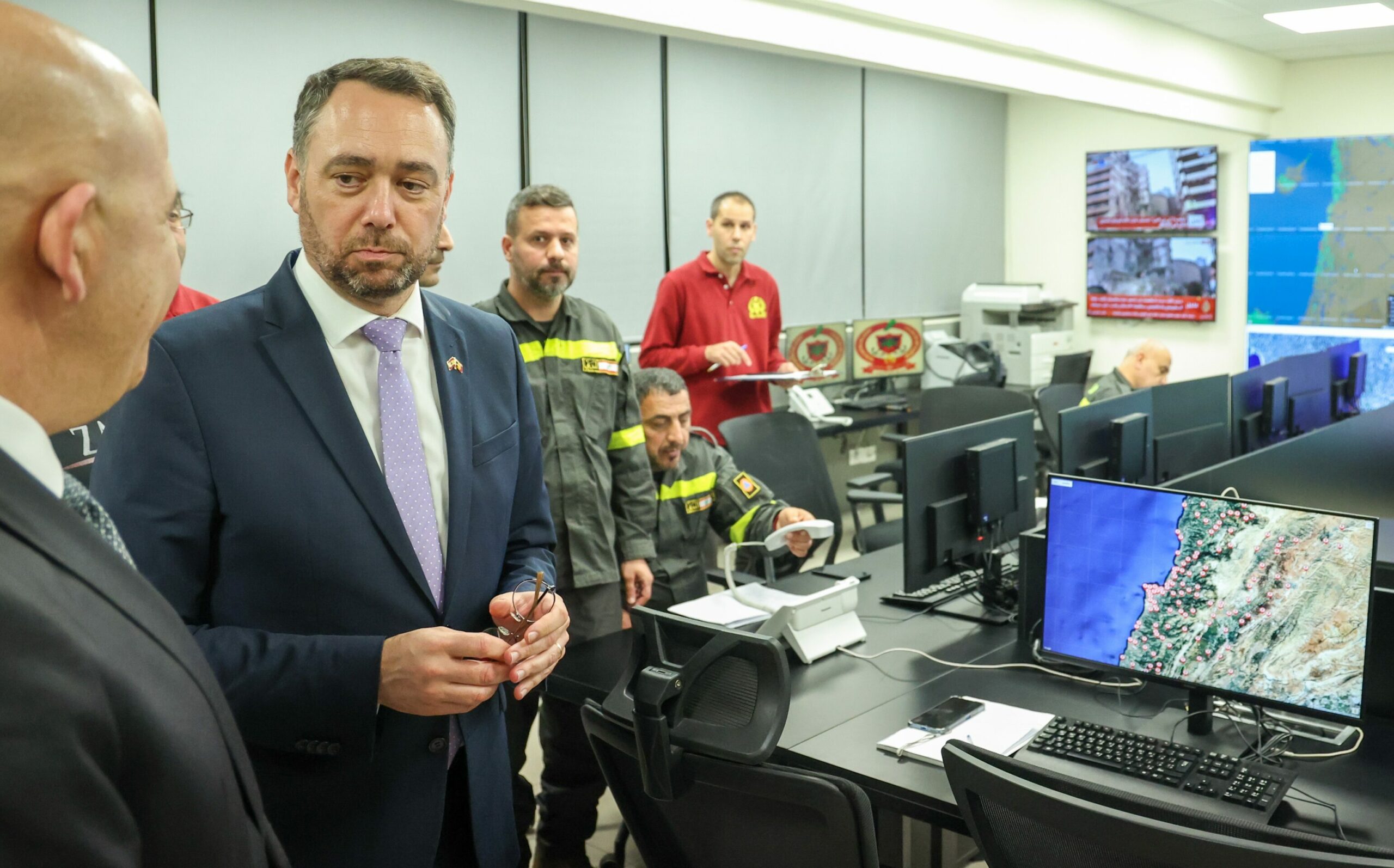 Director general of the Lebanese Civil Defense' Imad Khreich and Belgian Foreign Minister Maxime Prevot visit the Lebanon Mine Action Center in Beyrouth, Lebanon Wednesday 08 April 2026. Credit: Belga / Virginie Lefour