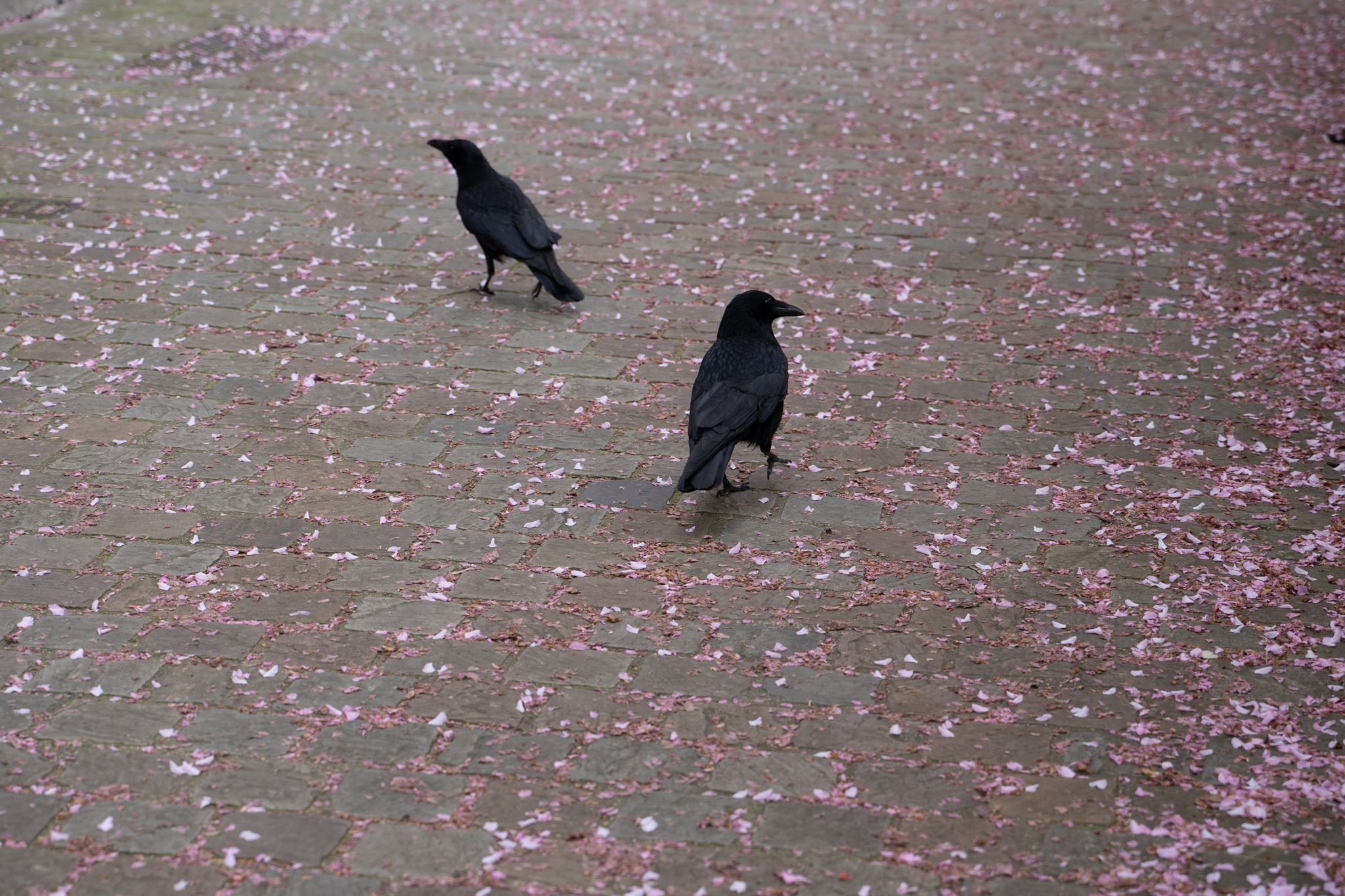 Crows walking down the cherry blossom-littered pavement of Avenue Emile Max. Credit: Vicente Torre Hovelson/The Brussels Times.