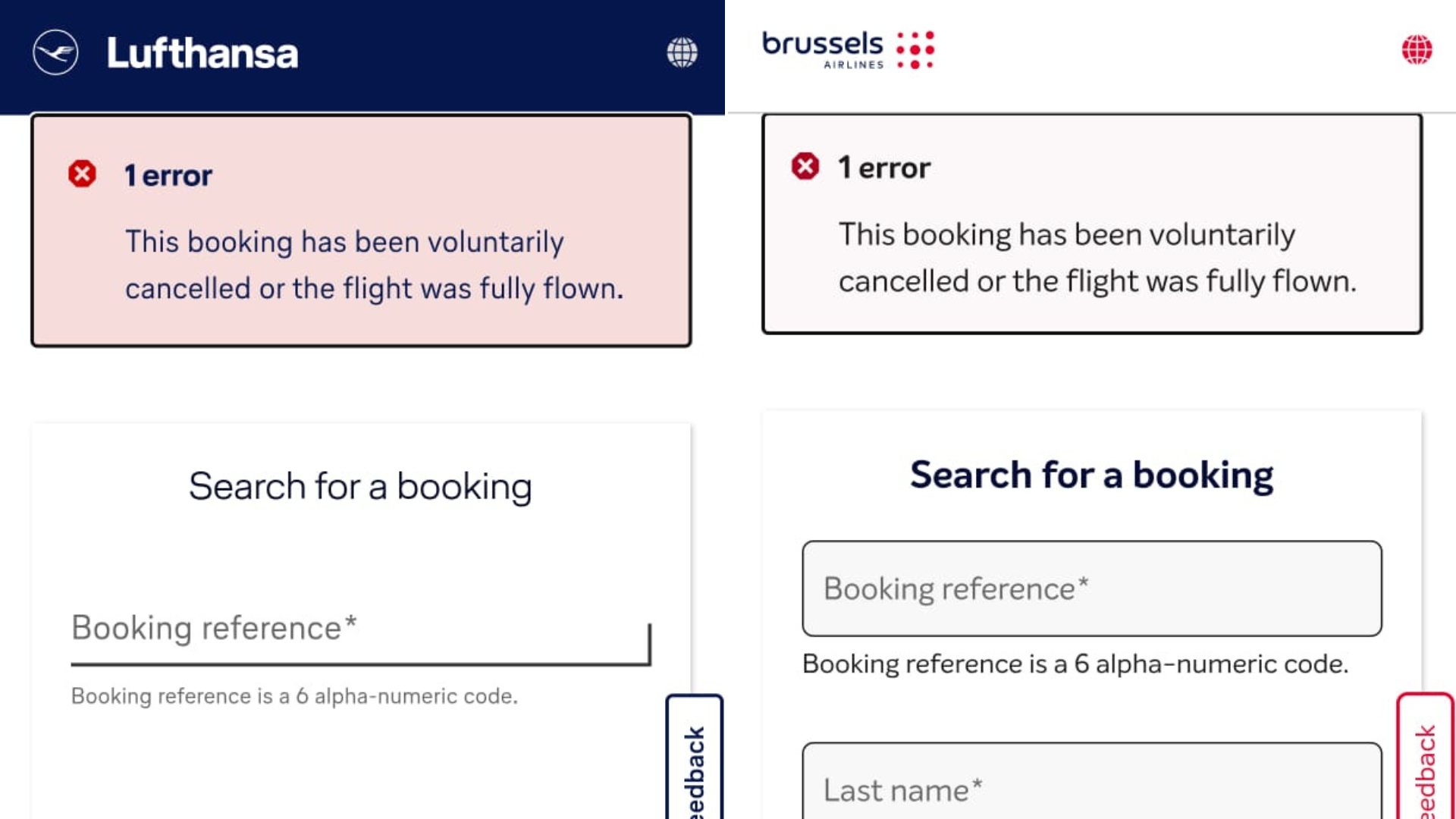 While all was normal for Saskia's flights, when searching for his wife's return information using her last name and the same booking reference, he was faced with an error message: "This booking has been voluntarily cancelled, or the flight was fully flown.”