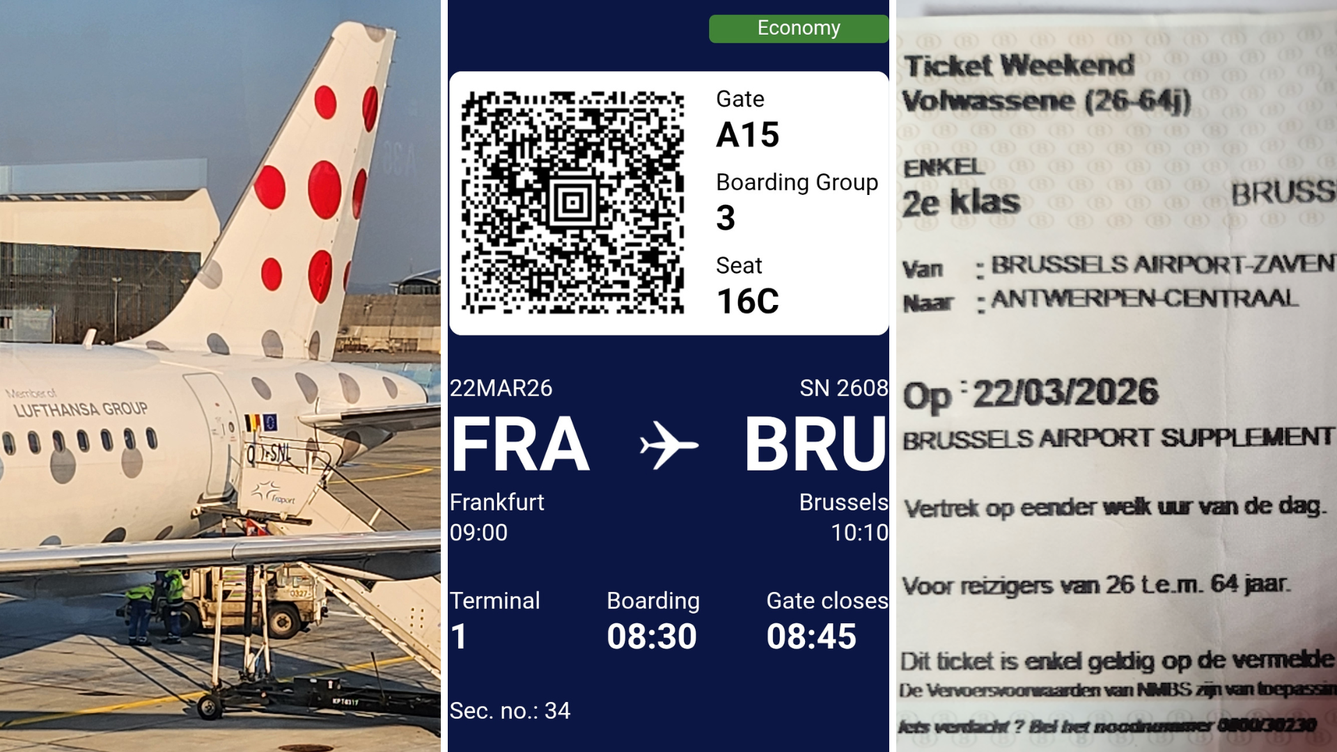 (L-R) Examples of evidence compiled by Mårtensson. Stairs with Frankfurt airport logo by a plane in a photograph taken by Mårtensson on 22 March, screenshot of Piret Mårtensson's outboud ticket to Brussels, a train ticket from Brussels Airport. Credit: Piret Mårtensson