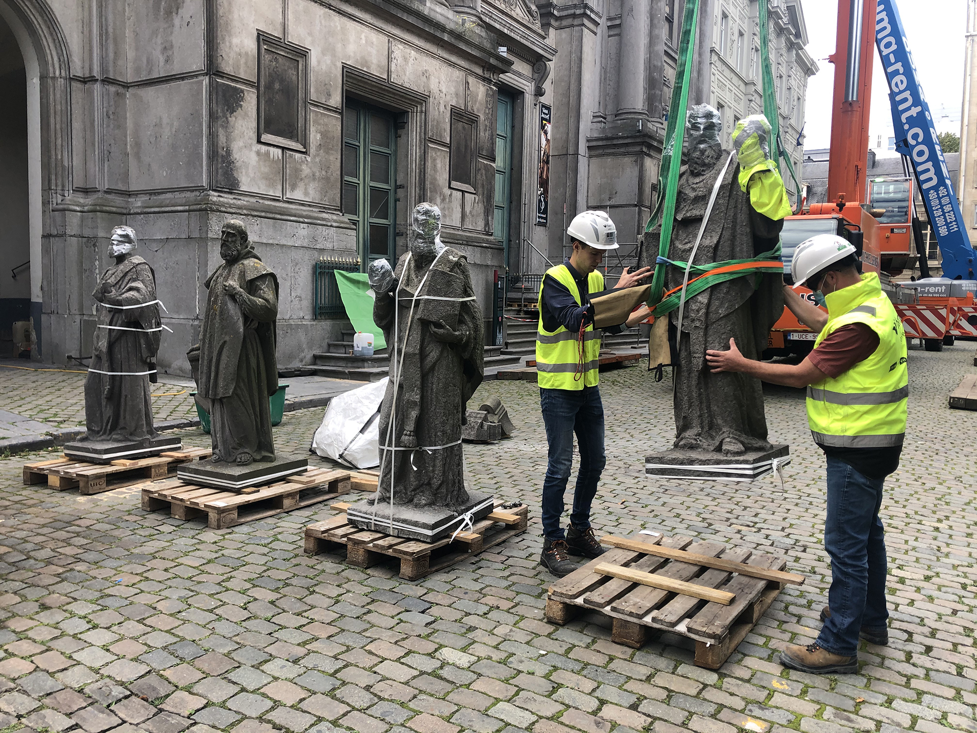 The intervention focused on preserving as much of the original structure as possible. The blue stone façade, sourced from the small town of Écaussinnes (Hainaut), had suffered significant weathering over time, while the upper towers required stabilisation.