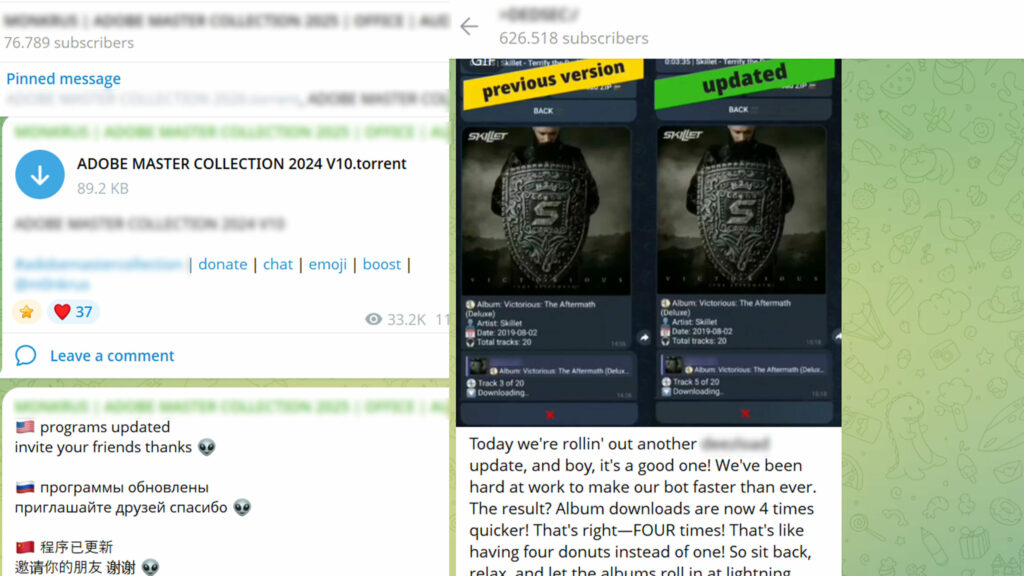 Public telegram groups run by enthusiasts promoting (1) pirated Adobe software and (2) song “ripping” of Spotify. Credit: screenshot by Kosmos Khoroshavin