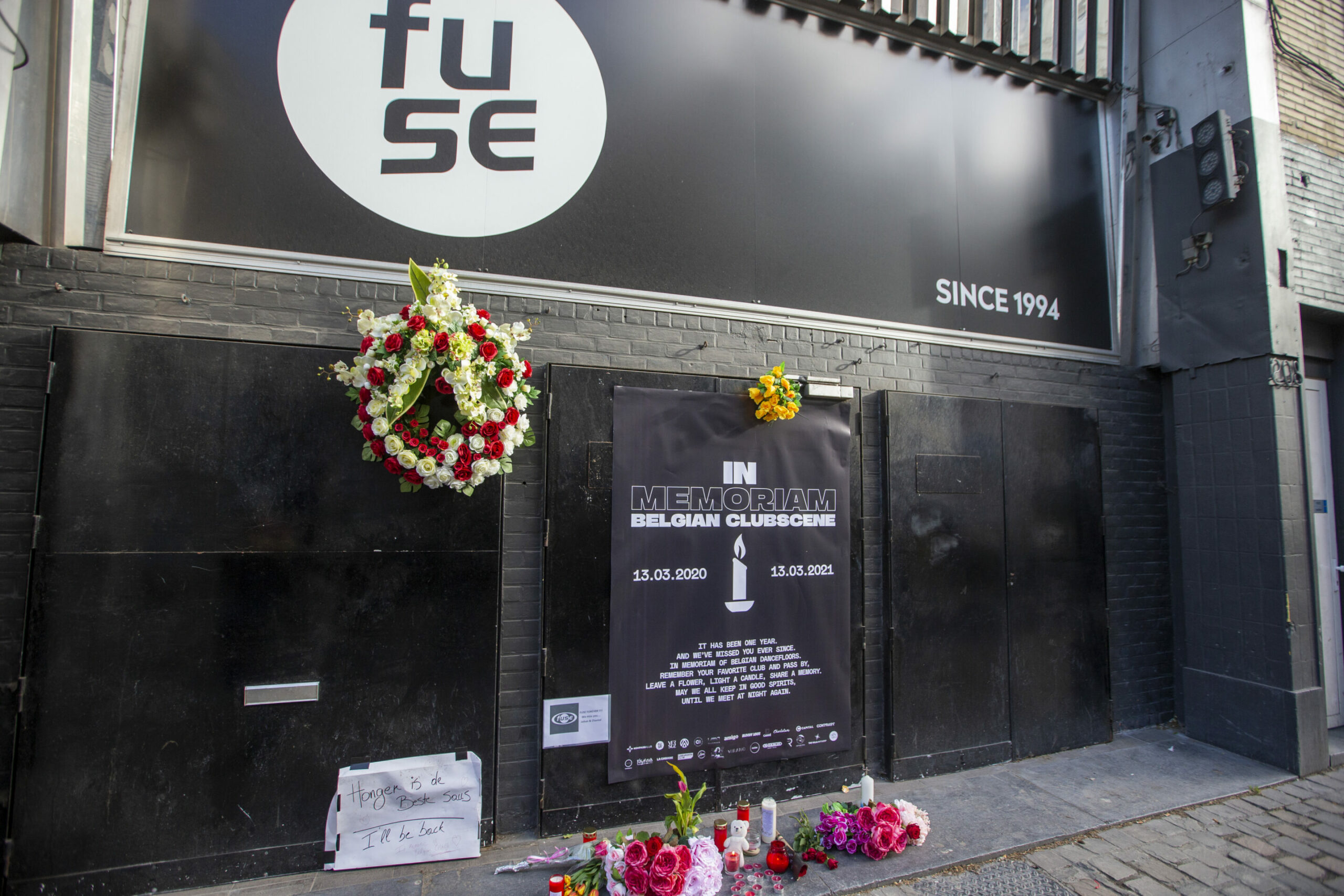 An illustration picture shows flowers and an 'In Memoriam' sign for the Belgian Clubscene at the entrance to Brussels' nightclub, during A symbolic moment of remembrance of the nightclubs one year after the closure, in Brussels, Saturday 13 March 2021. Credit: Belga / Nicolas Maeterlinck
