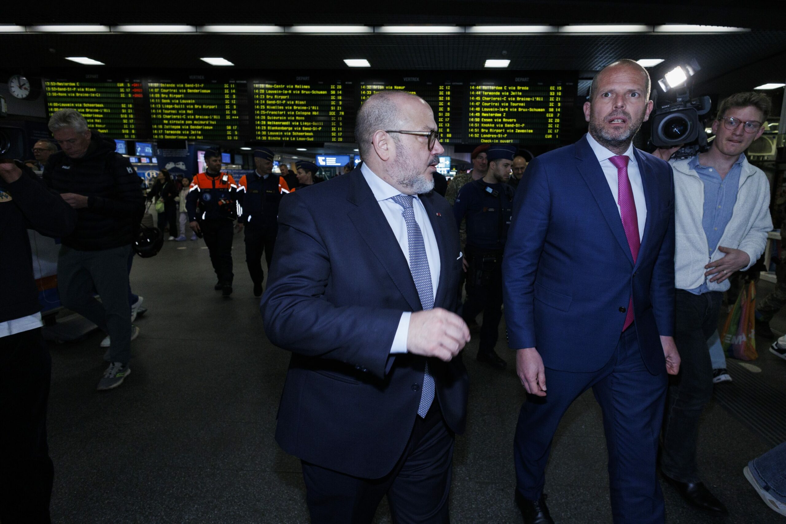 Minister of Interior Bernard Quintin (MR) and Minister of Defence Theo Francken (N-VA) pictured during a visit to the Brussels-Midi station to inspect the deployment of soldiers in stations, Friday 03 April 2026. Credit: Belga / Nicolas Maeterlinck