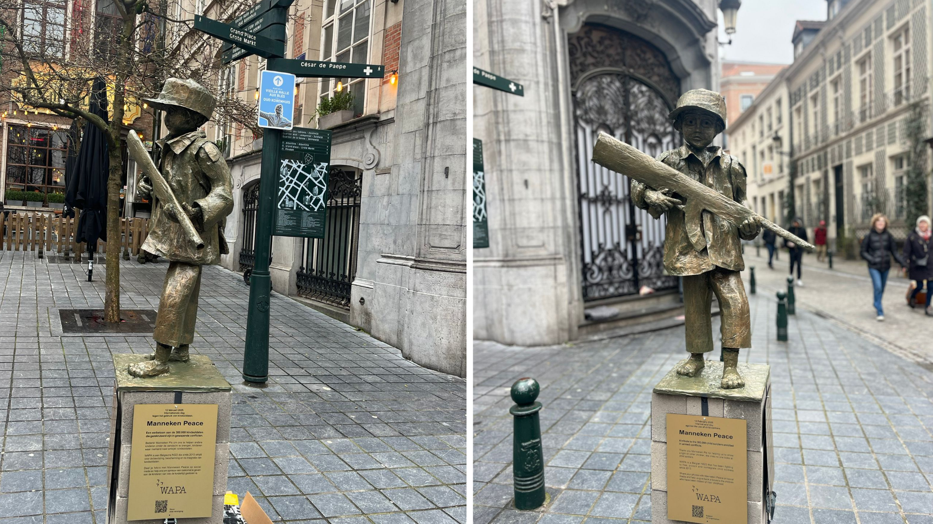A statue titled 'Manneken Peace' was unveiled on Wednesday opposite the famous Manneken Pis in the heart of Brussels.